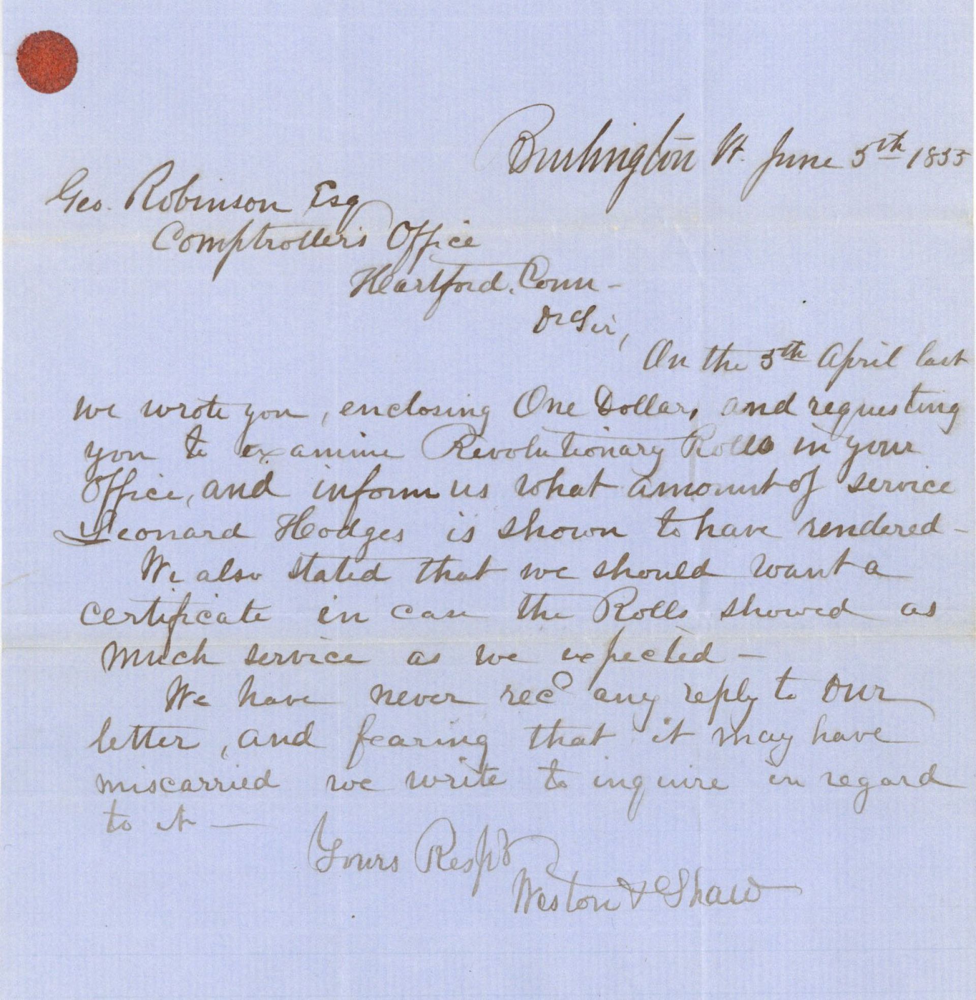 Revolutionary War Pension for Leonard Hodges - Connecticut - 1855 dated American Revolutionary War