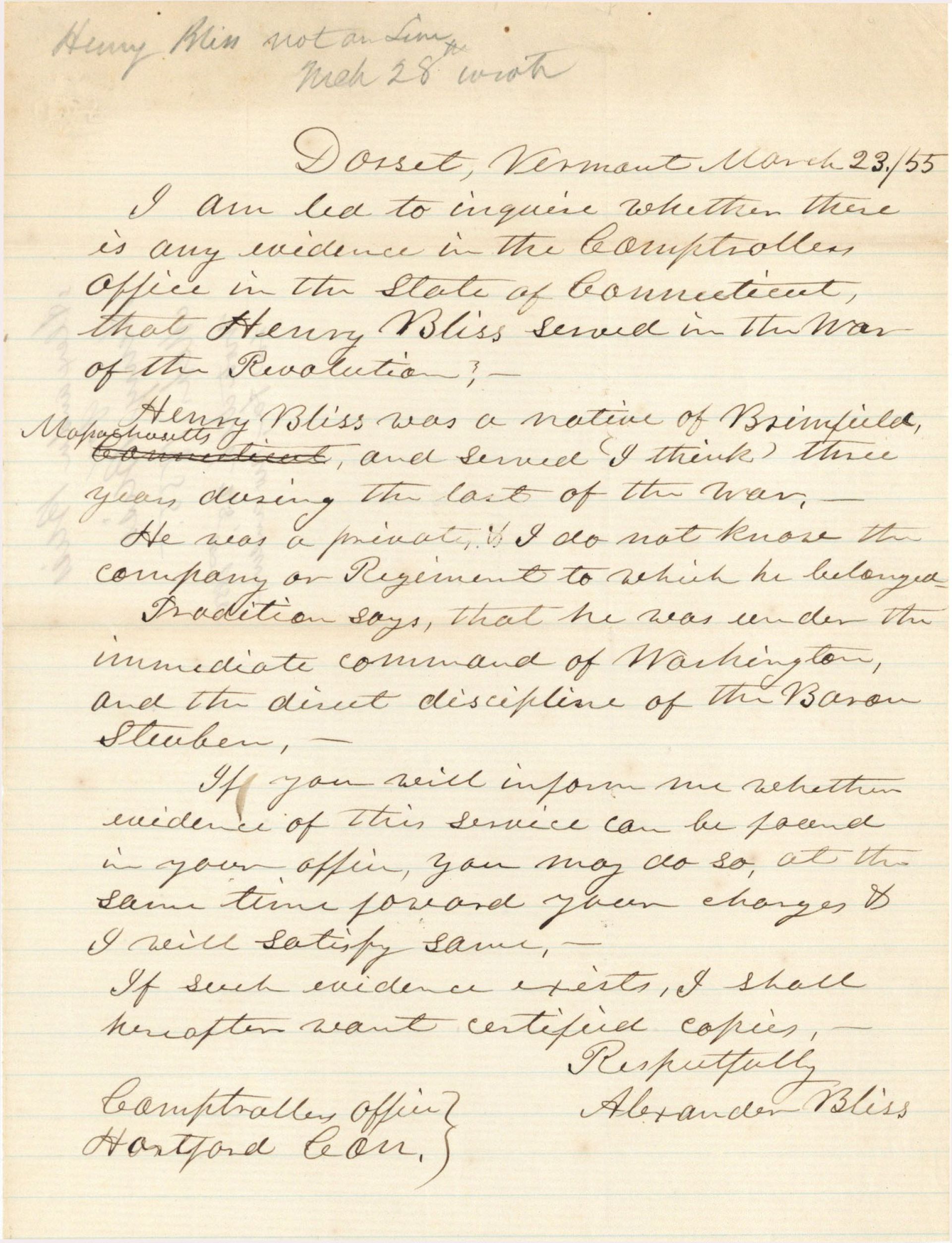 Letter regarding Revolutionary War Pension for Henry Bliss.