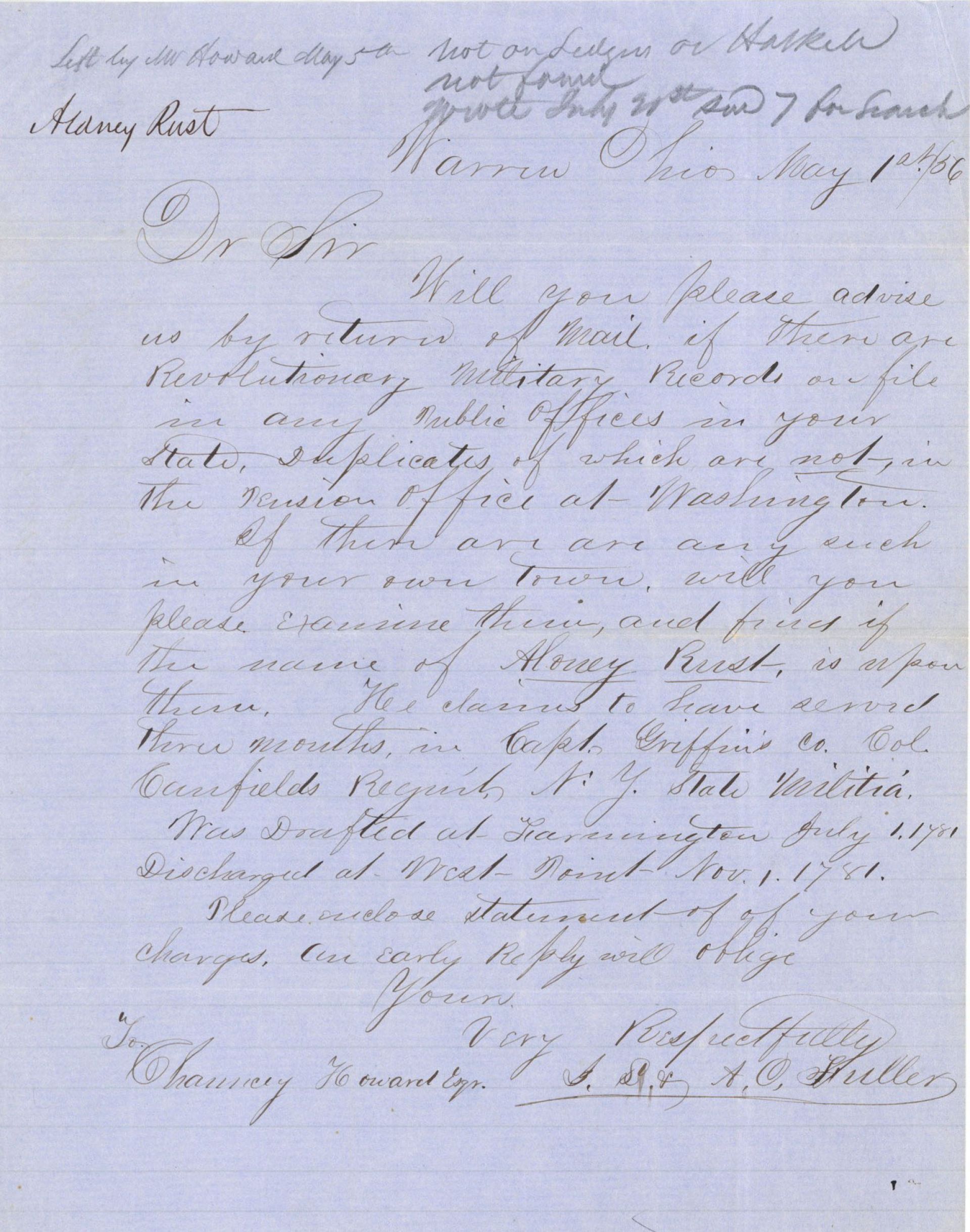 Letter regarding Revolutionary War Pension for Aloney Rust.
