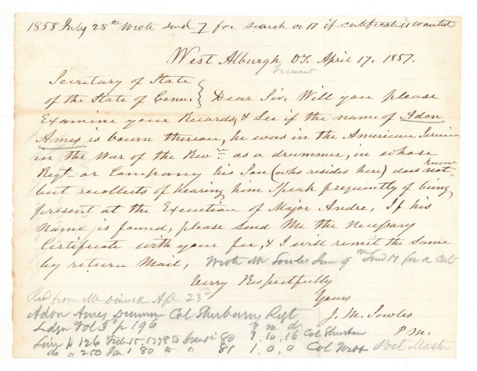 Letter regarding Revolutionary War Pension for Adon Ames.