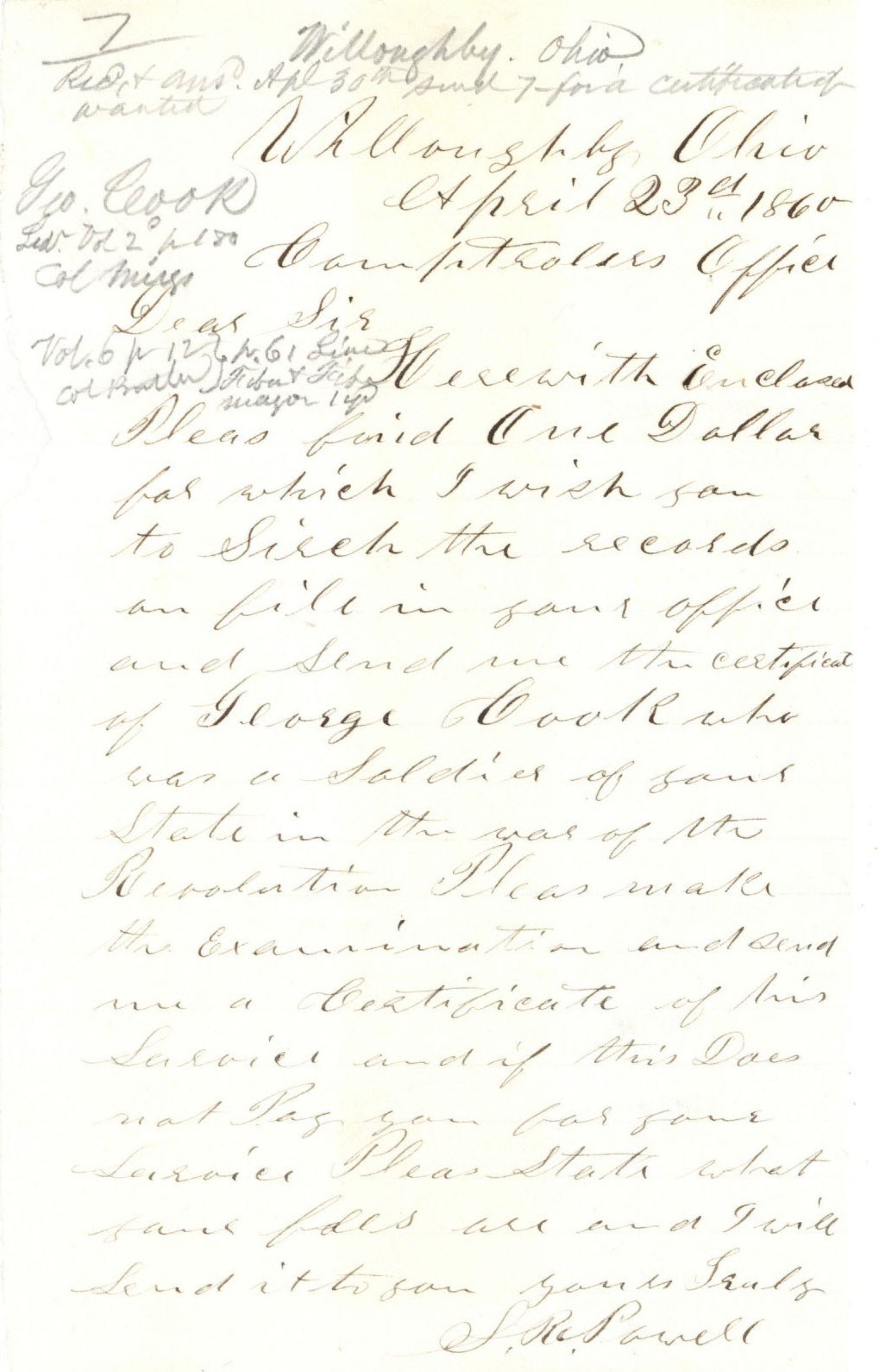 Letter regarding Revolutionary War pension for George Cook. Paper tear.