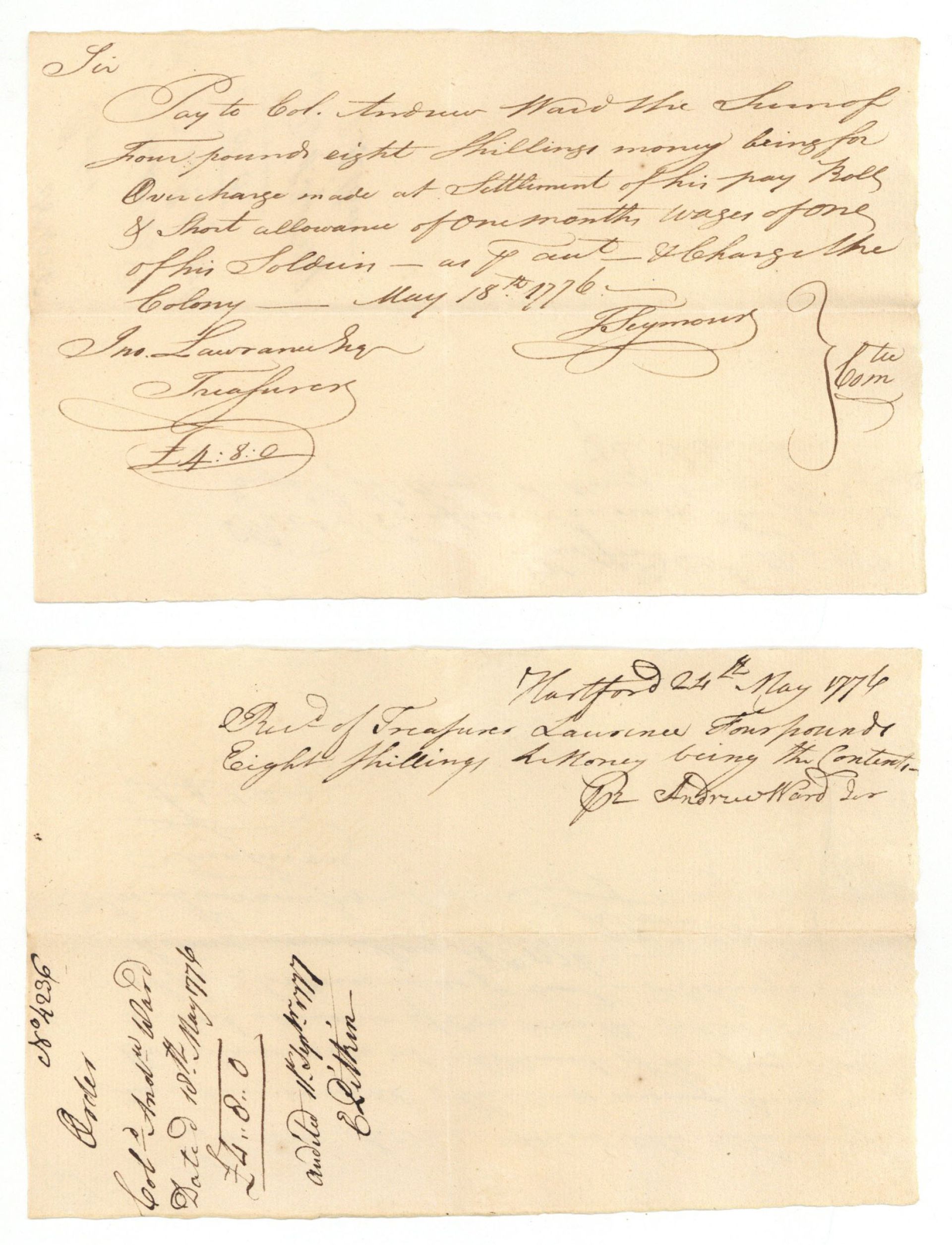 1776 dated Pay Order signed by John Lawrence and T. Seymour - American Revolutionary War Autograph