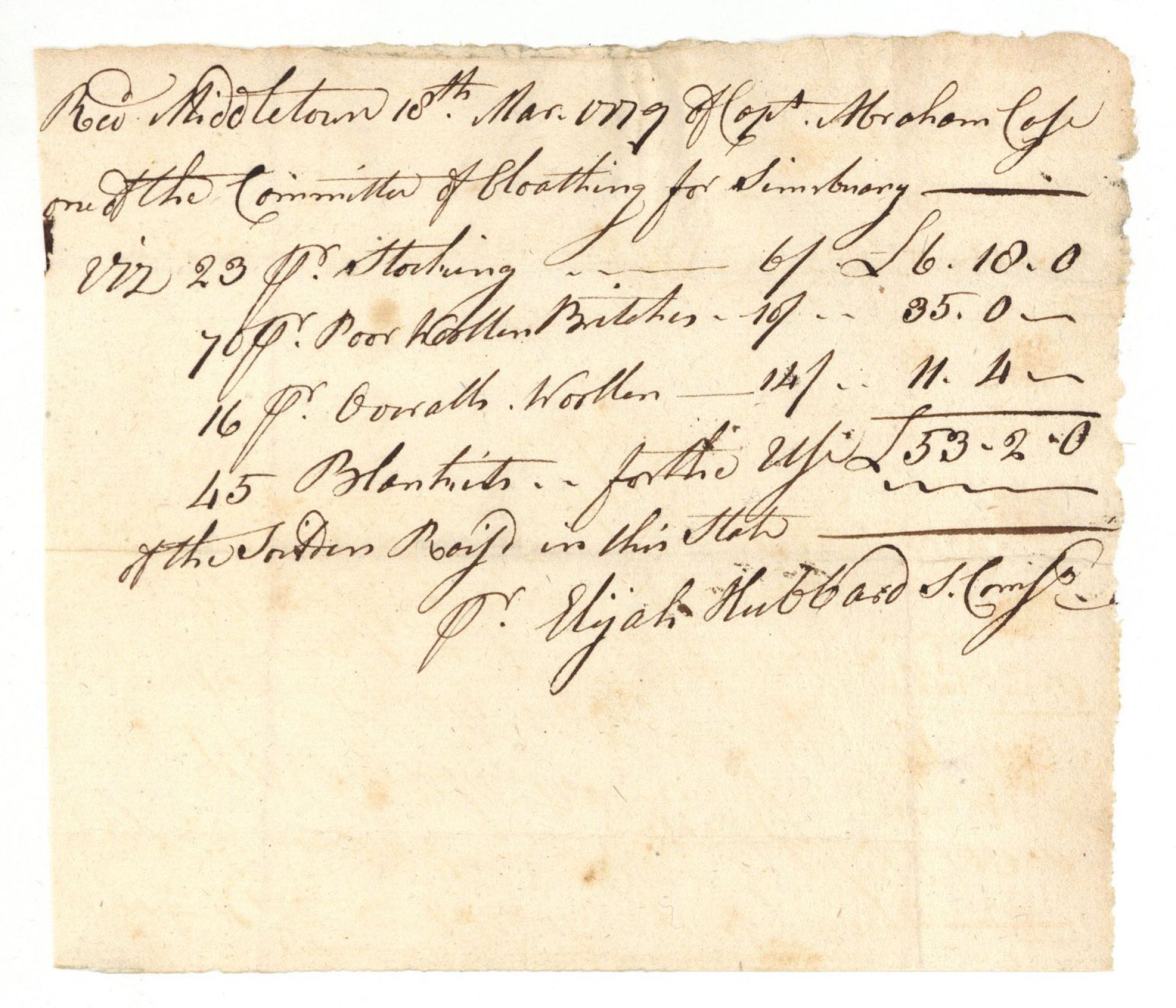 Handwritten list "of the Committee of Clothing for Simsbury"...stockings and blankets etc. for the military.