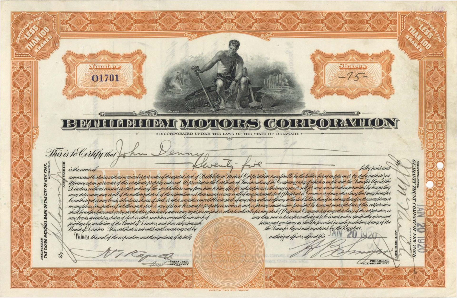 Bethlehem Motors Corporation - 1920 dated Automotive Stock Certificate