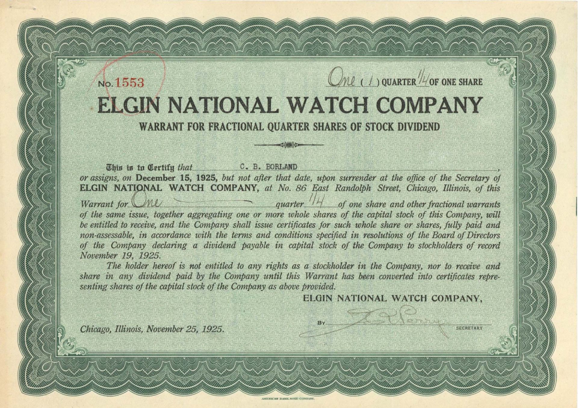 Elgin National Watch Co. - 1925 dated Timepiece Stock Certificate - Watch Maker from 1864 to 1968