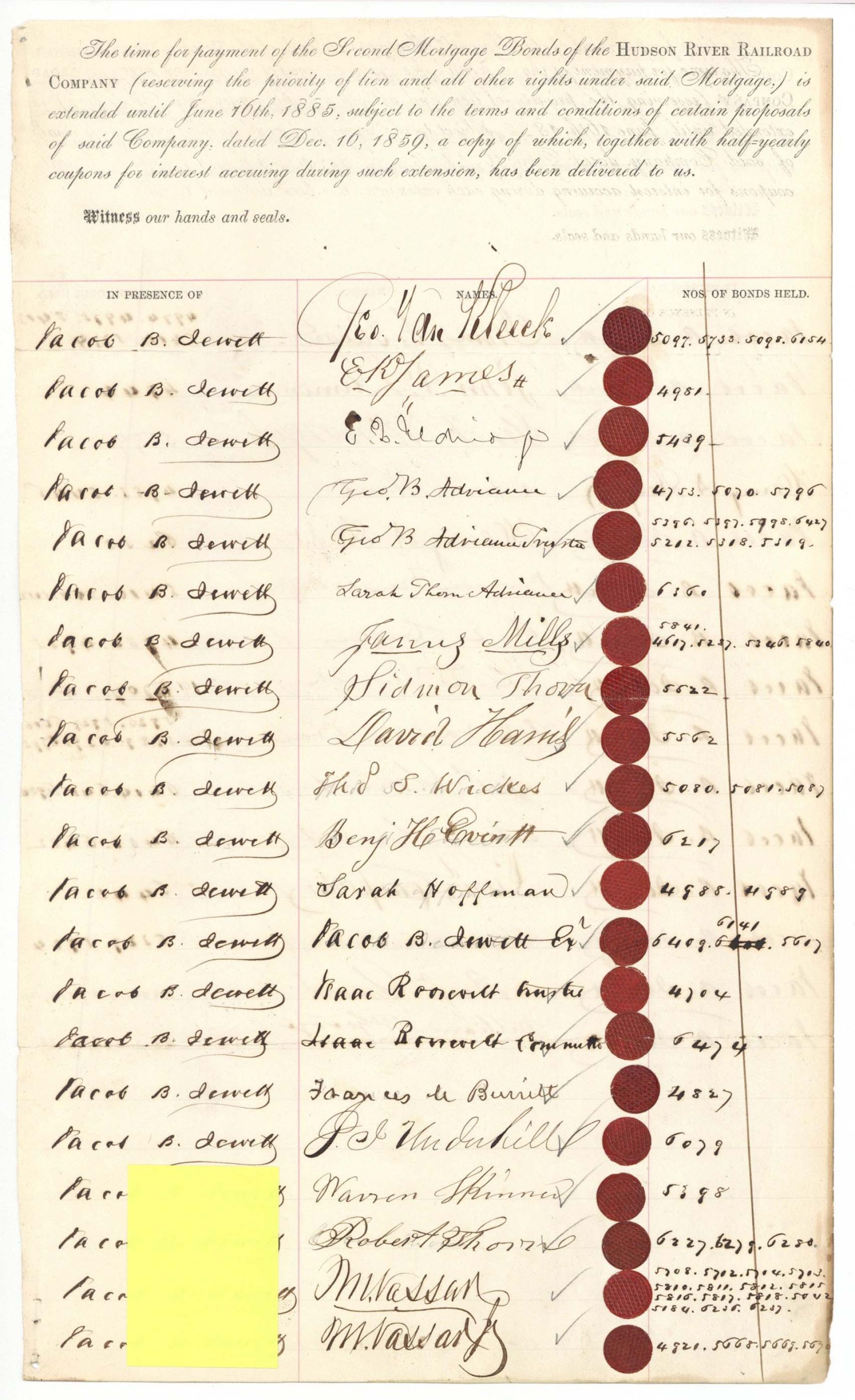 Hudson River Railroad Bond Receipt Sheet signed by Matthew Vassar Jr. twice - 1859 dated Autographed Document