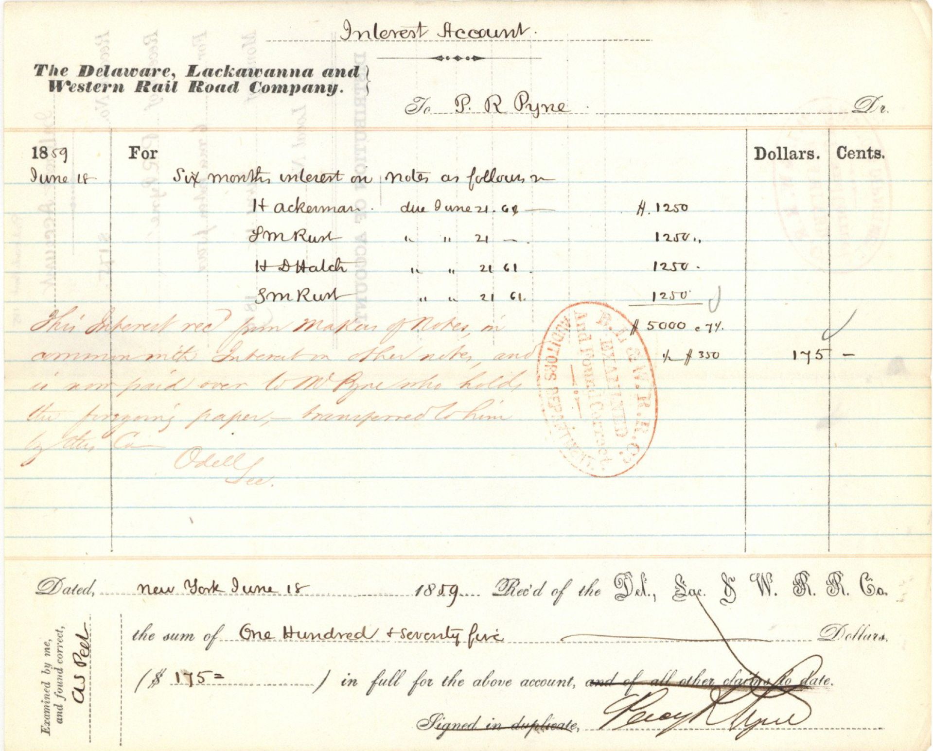 Delaware, Lackawanna and Western Rail Road Co. Interest Accout signed by Percy R. Pyne - 1859 dated Autograph