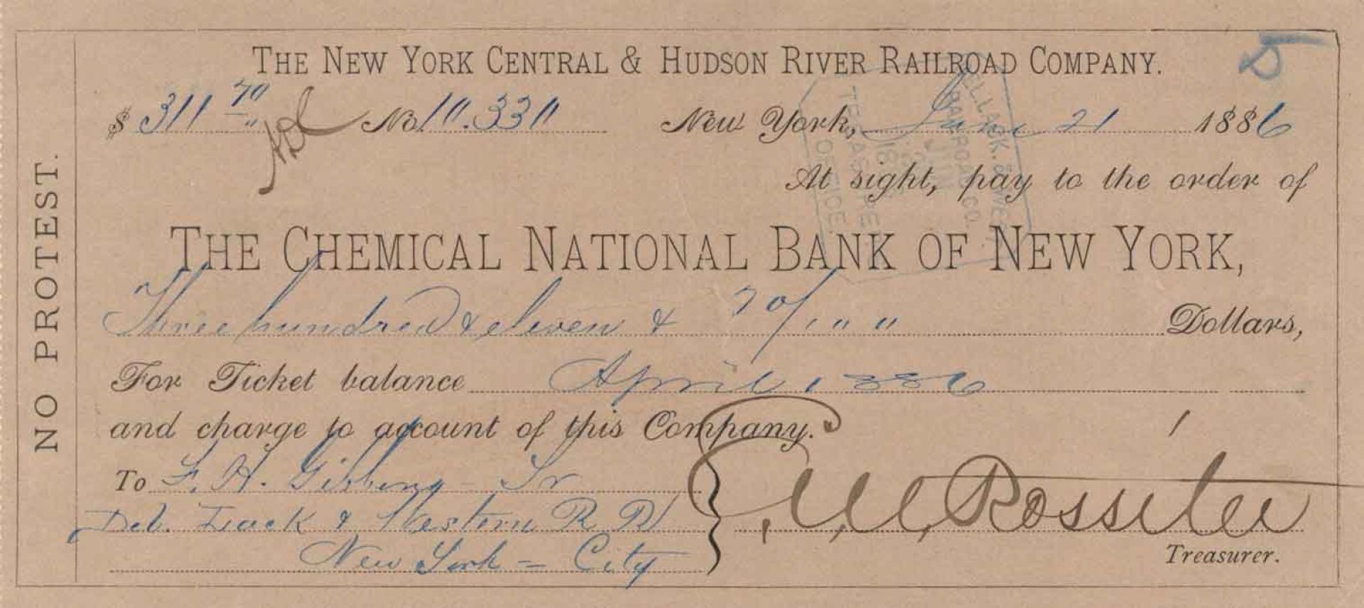 New York Central & Hudson River Railroad Company Check signed by E.V.W. Rossiter.
