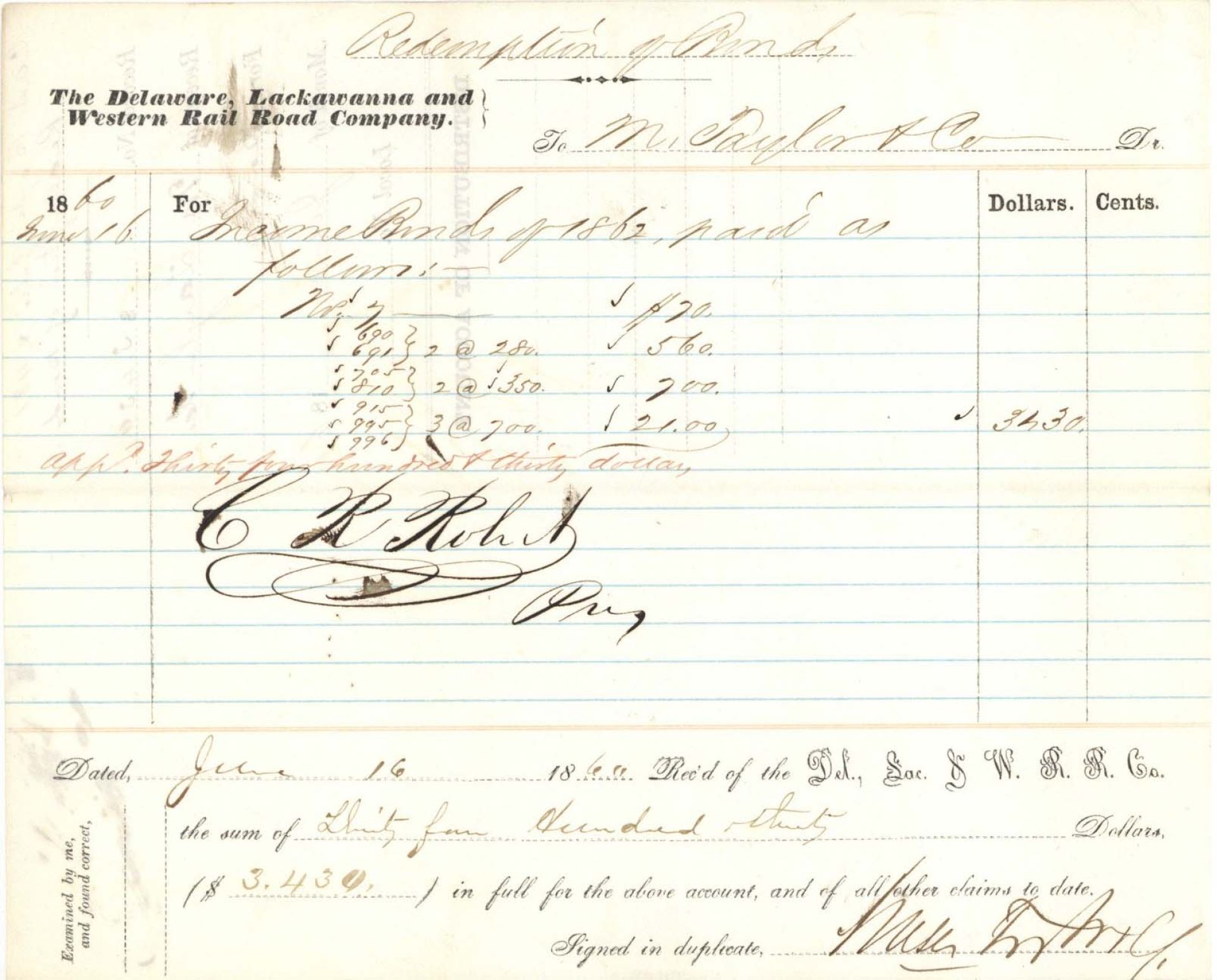 Delaware, Lackawanna and Western Rail Road Co. signed by Moses Taylor - 1860 dated Redemption of Bonds, Script Stock or Reserved Fund