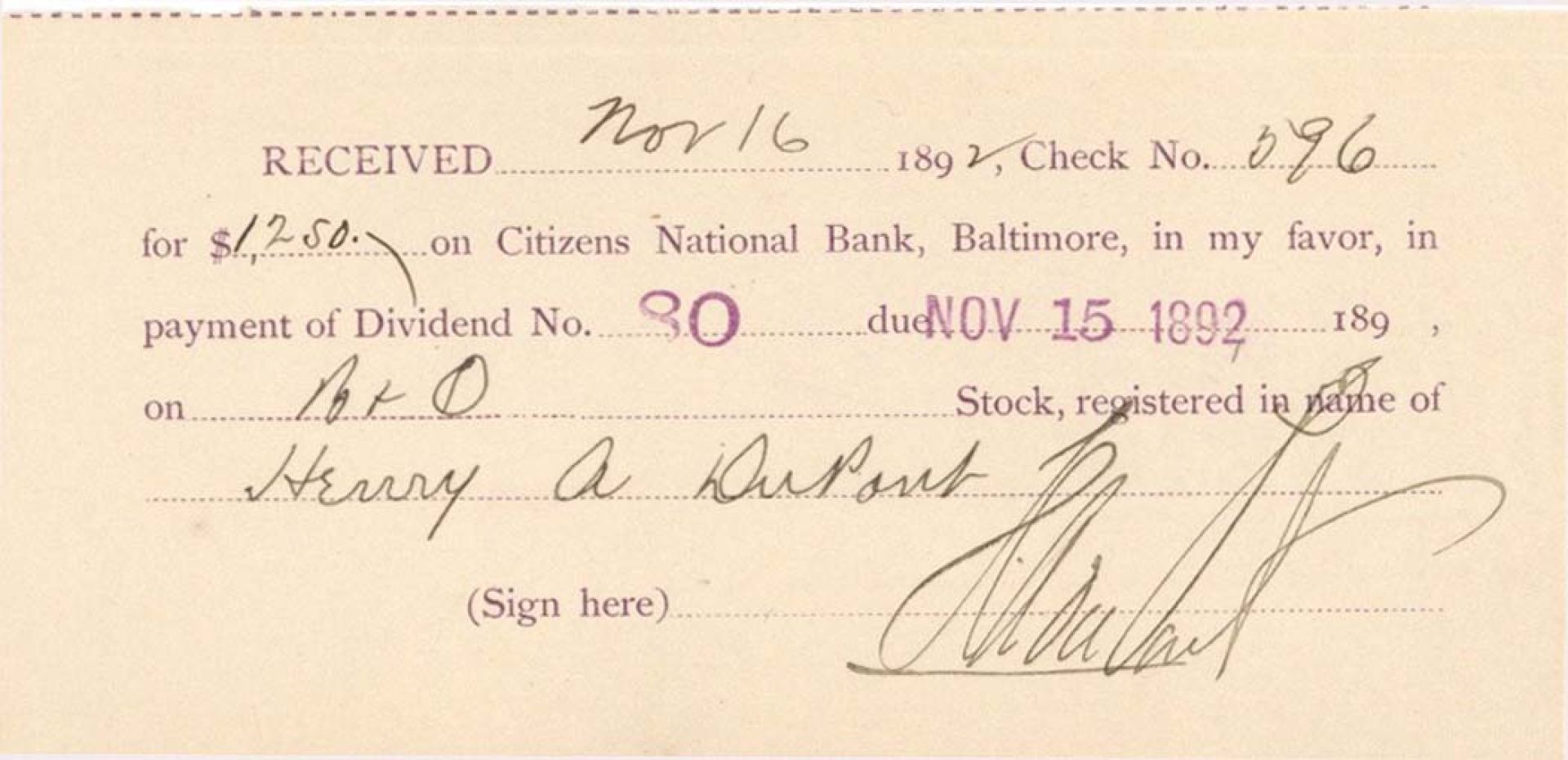 Baltimore and Ohio Receipt signed by Henry A. du Pont - 1892 dated Autograph