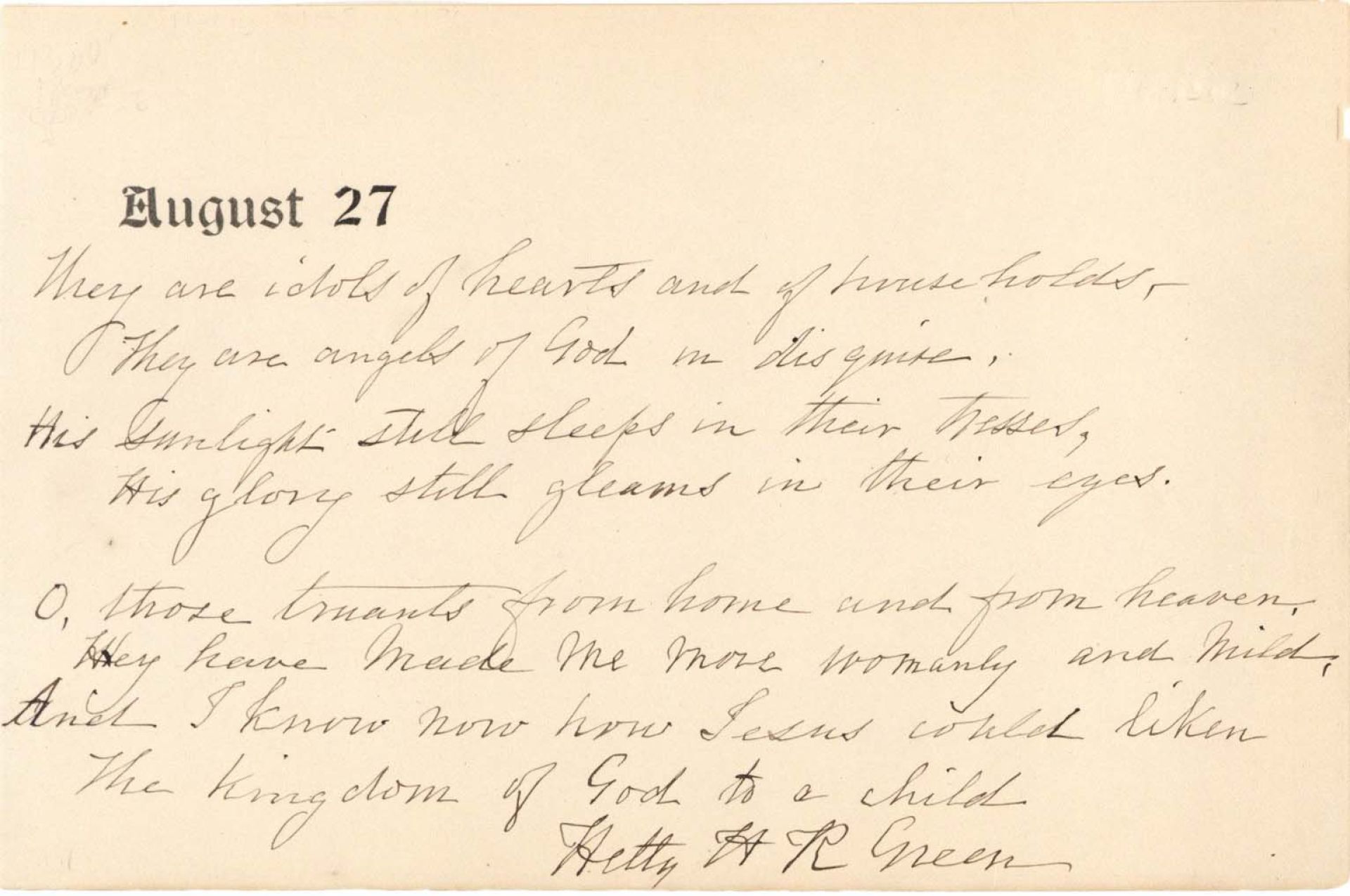 Inv# AU1894 AutographCharles Dickinson quote copied and signed by Hetty H R Green. Green substituted "womanly" for Dickinson's "manly" on the sixth line of the quote.