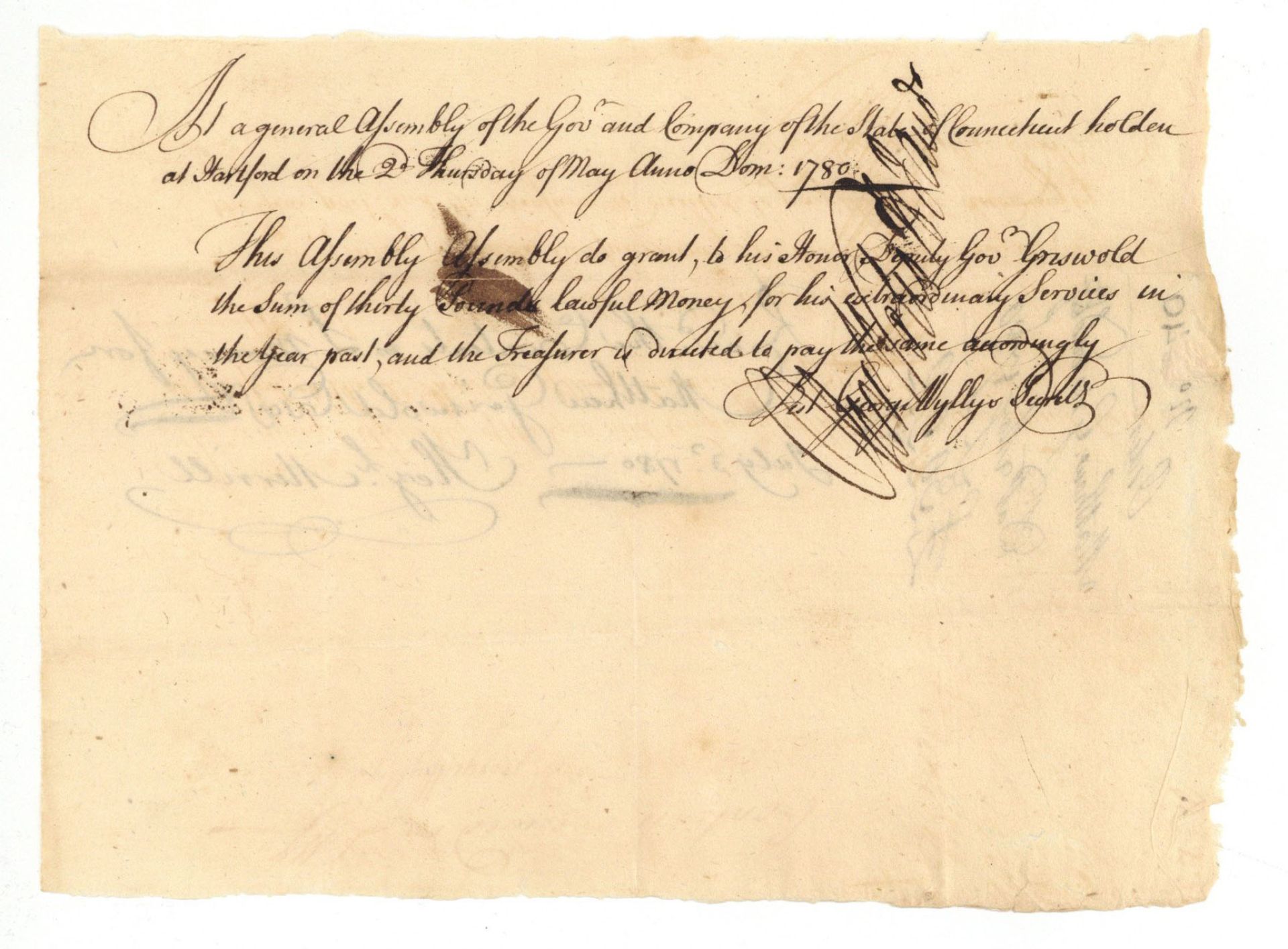 Grant of 30 Pounds signed by Oliver Wolcott, Jr. - Connecticut - 1780 dated American Revolutionary War