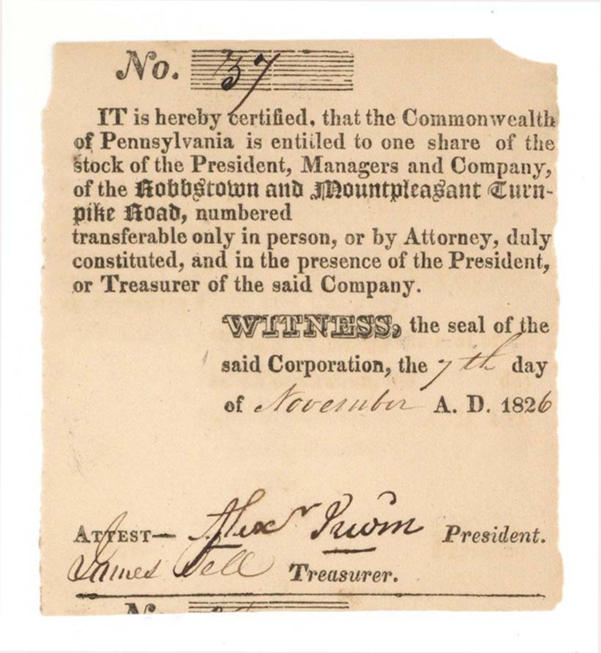 President Managers and Co. of the Hobbstown and Mountpleasant Turnpike Road - 1826 dated Early Turnpikes