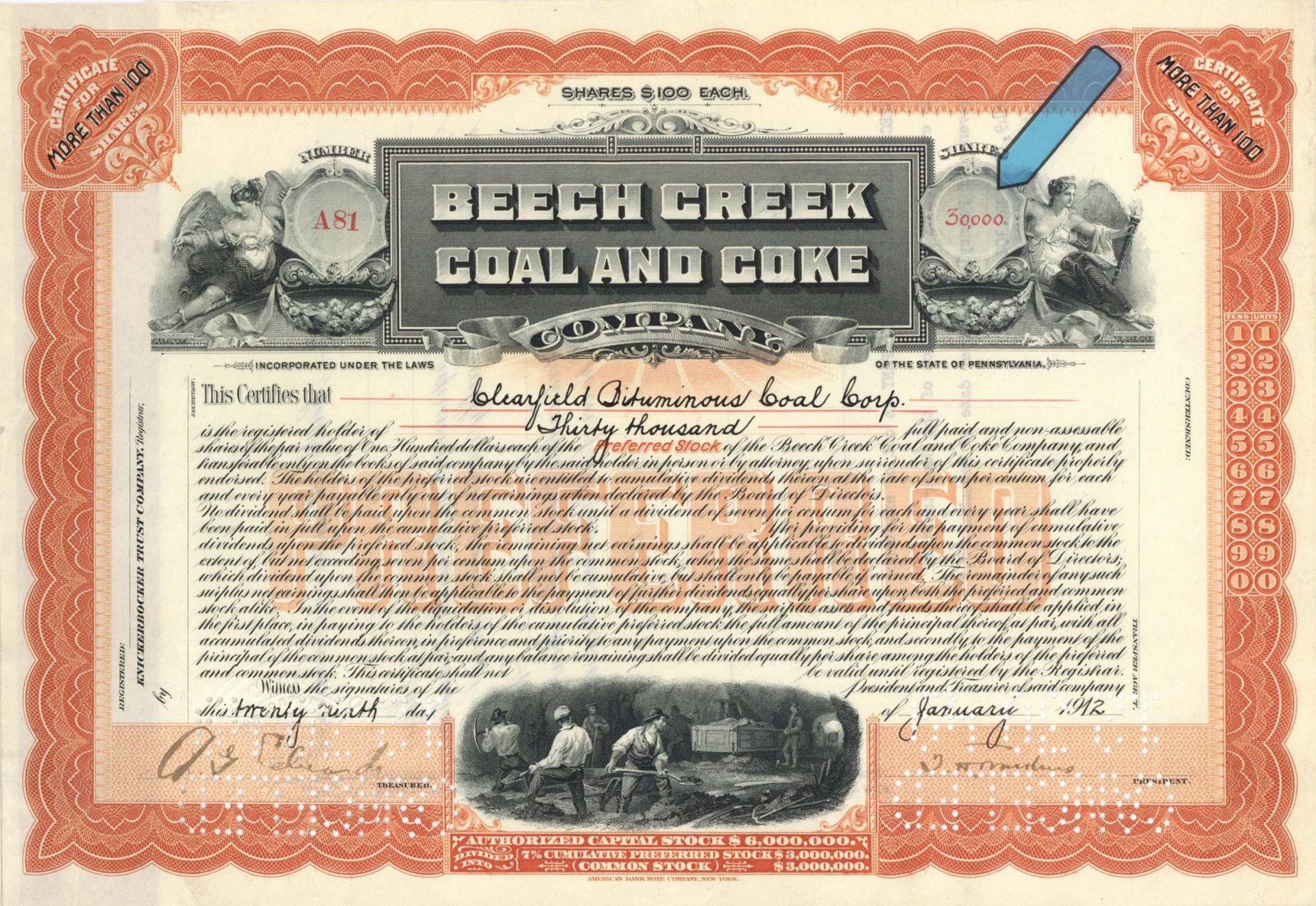 Beech Creek Coal and Coke Co. - 1911 or 1912 dated High Denomination Stock Certificate