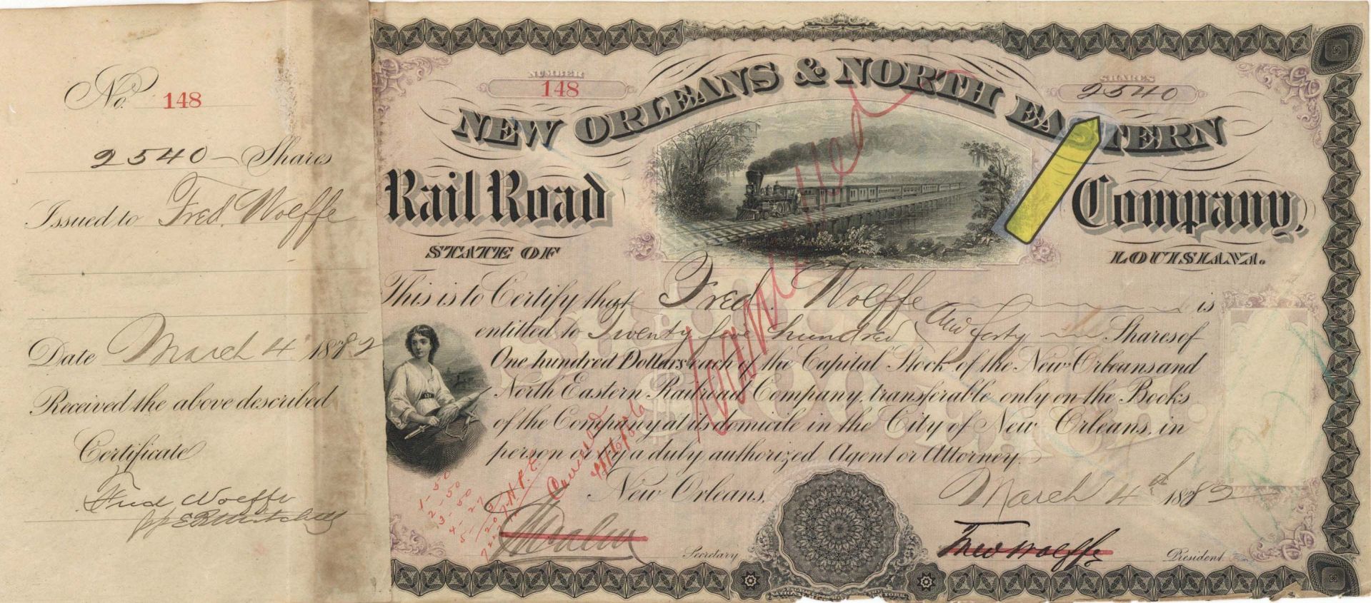 New Orleans and North Eastern Rail Road Co. - 1882 dated High Denomination Stock Certificate