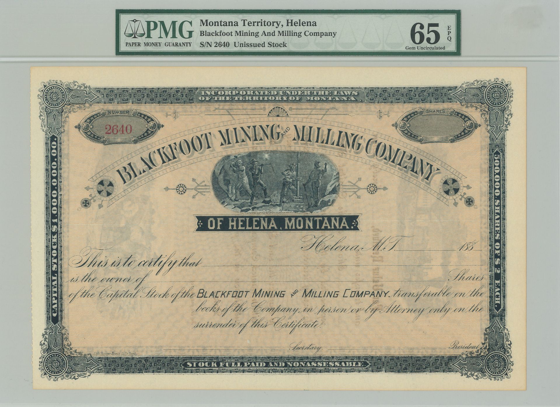 Blackfoot Mining and Milling Co. - Graded by PMG 65 EPQ Gem Uncirculated - 1880's dated Mining Stock Certificate
