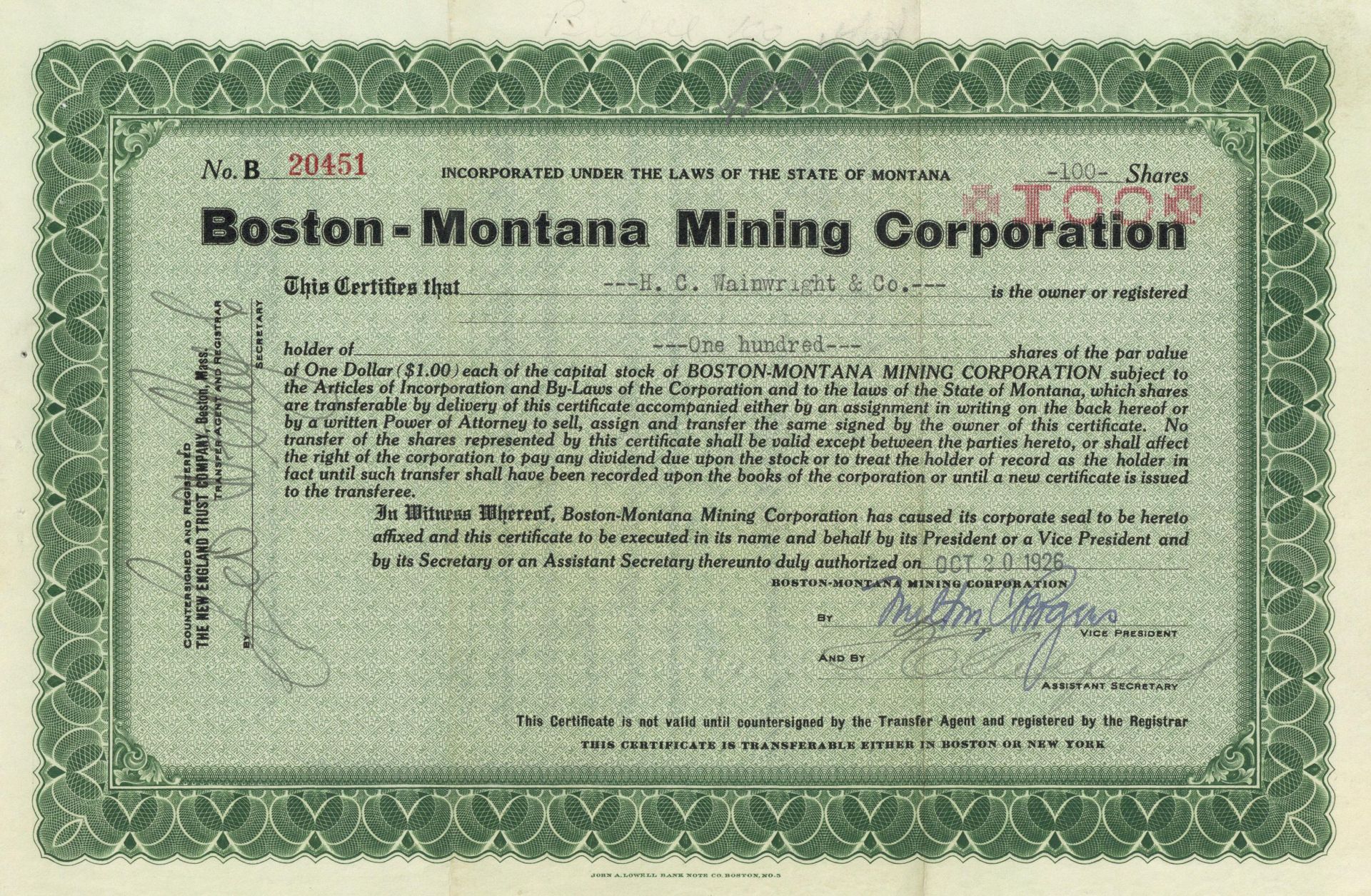 Boston-Montana Mining Corporation - 1920's dated Montana Mining Stock Certificate