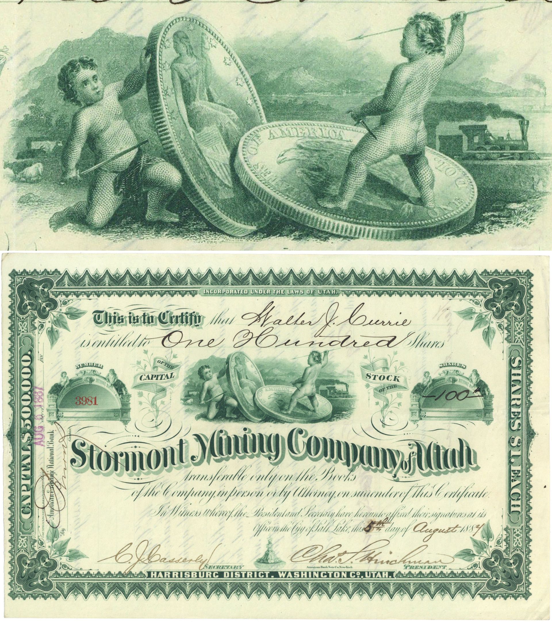 Inv# MS1081 StockUncanceled Stock. Located Harrisburg District, Washington County, Utah. Rich Green color and outstanding graphics including a vignette of nude babies fighting with spears and using Liberty Seated Silver Dollars as shields. One of the prettiest mining stocks ever printed by American Bank Note Co., New York! Very Scarce!
