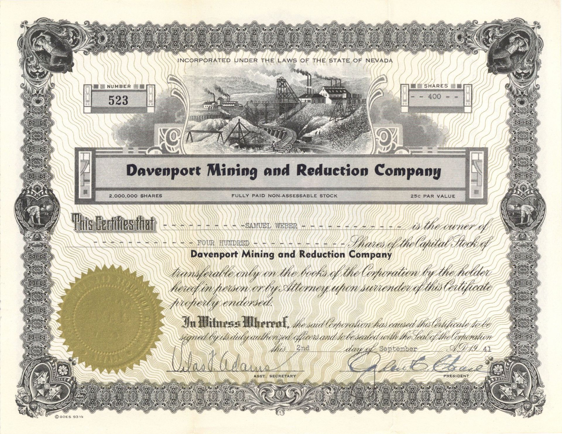 Davenport Mining and Reduction Co. - 1941 or 1942 dated Stock Certificate