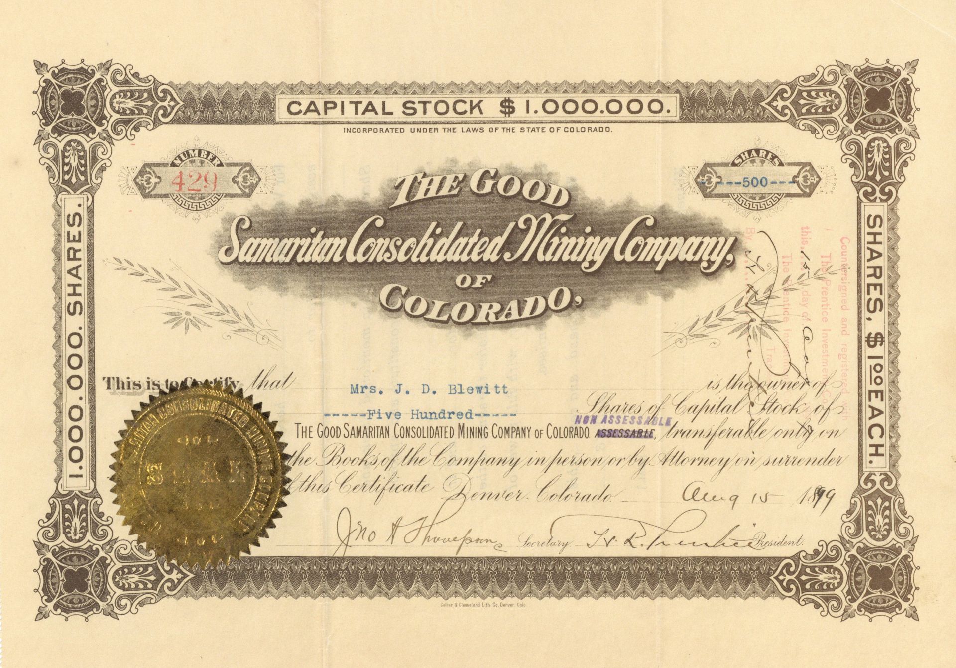 Good Samaritan Consolidated Mining Co. of Colorado - 1899 dated Colorado Mining Stock Certificate