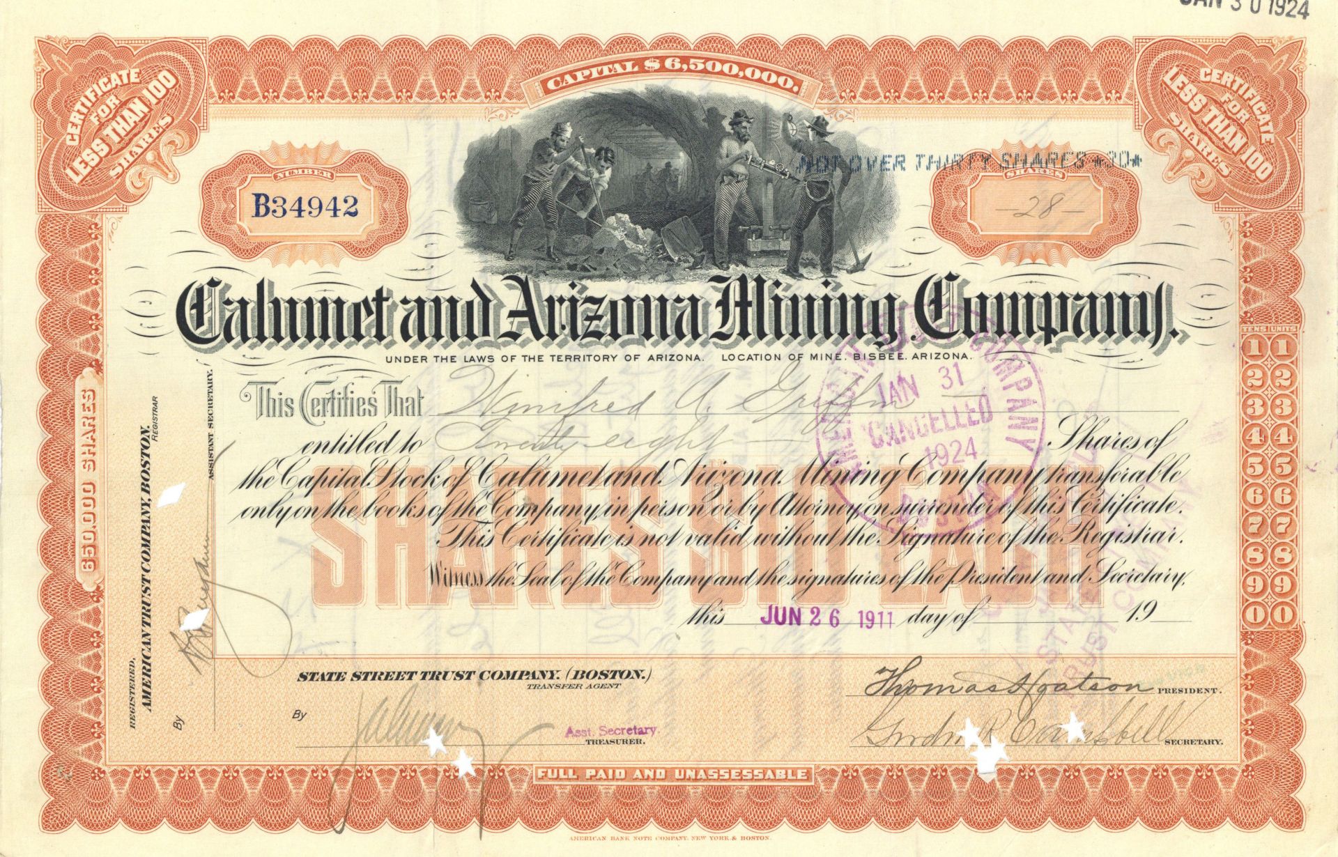 Calumet and Arizona Mining Co. - 1906-1921 dated Arizona Mining Stock Certificate - Mine in Bisbee, Arizona