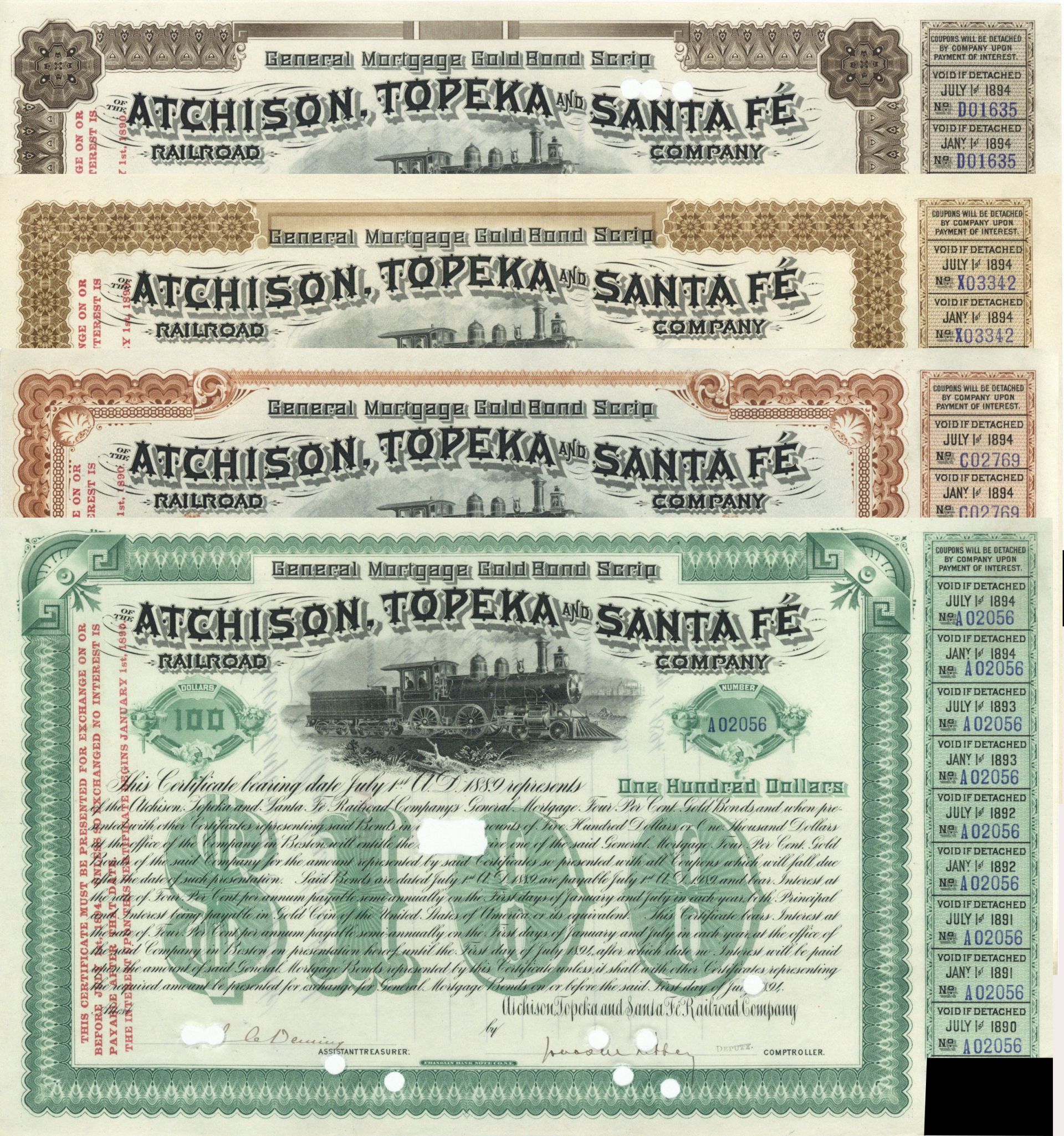 Collection of Four Different Bonds of the Atchison, Topeka and Santa Fe Railroad - 1890's dated Collection of 4 Bonds