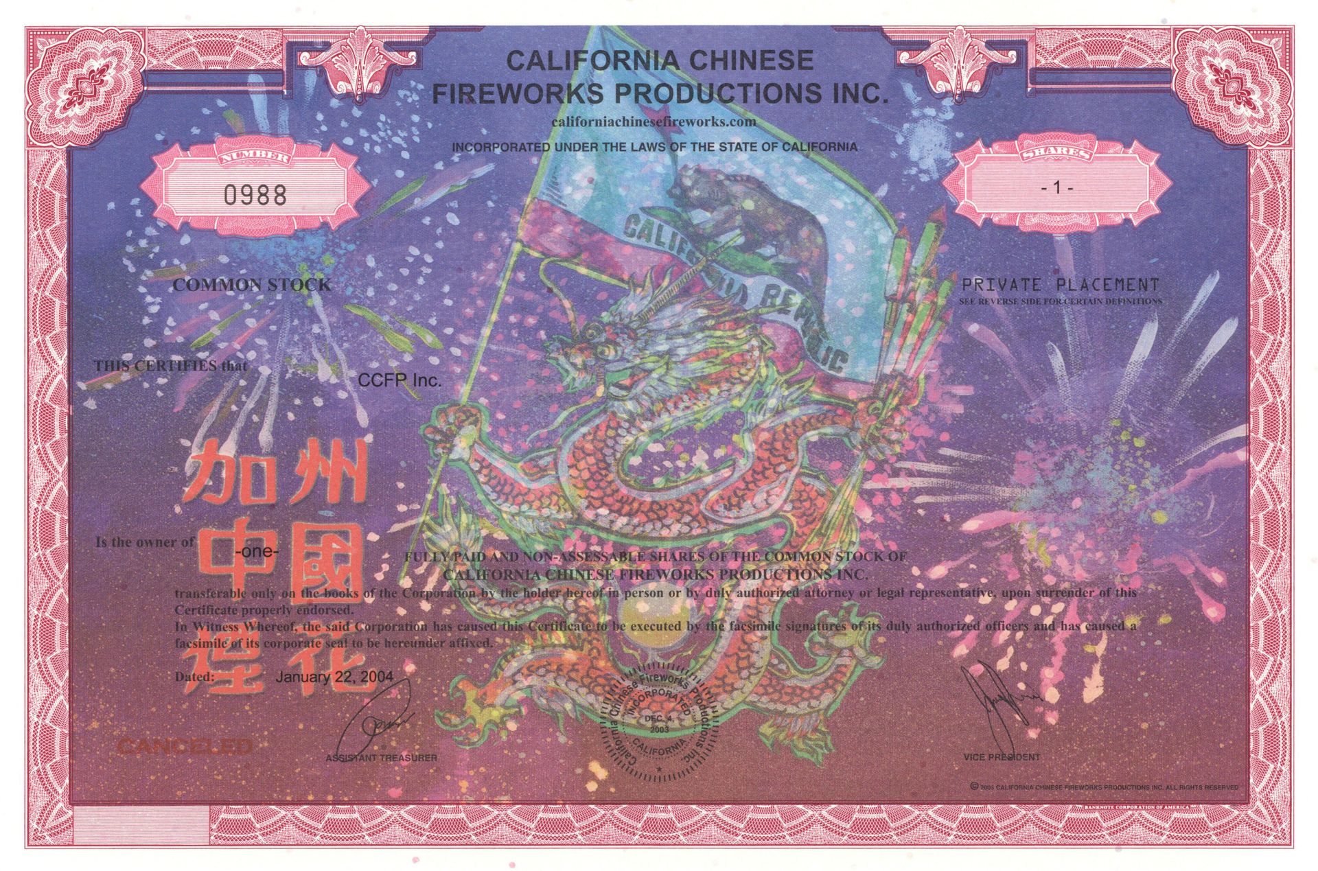 California Chinese Fireworks Productions Inc. - 2004 dated Fireworks Company Stock Certificate - Very Rare Topic