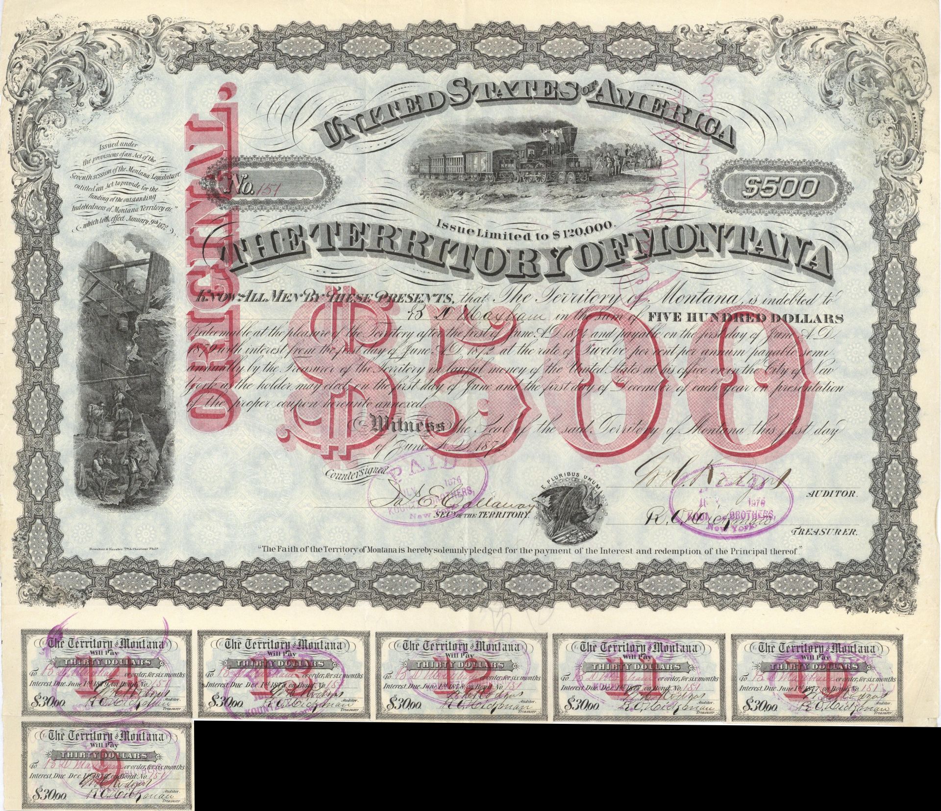 Territory of Montana - Very Rare 1872 Gorgeous $500 Bond with Red Underprint - Beautiful Bond for a Beautiful State