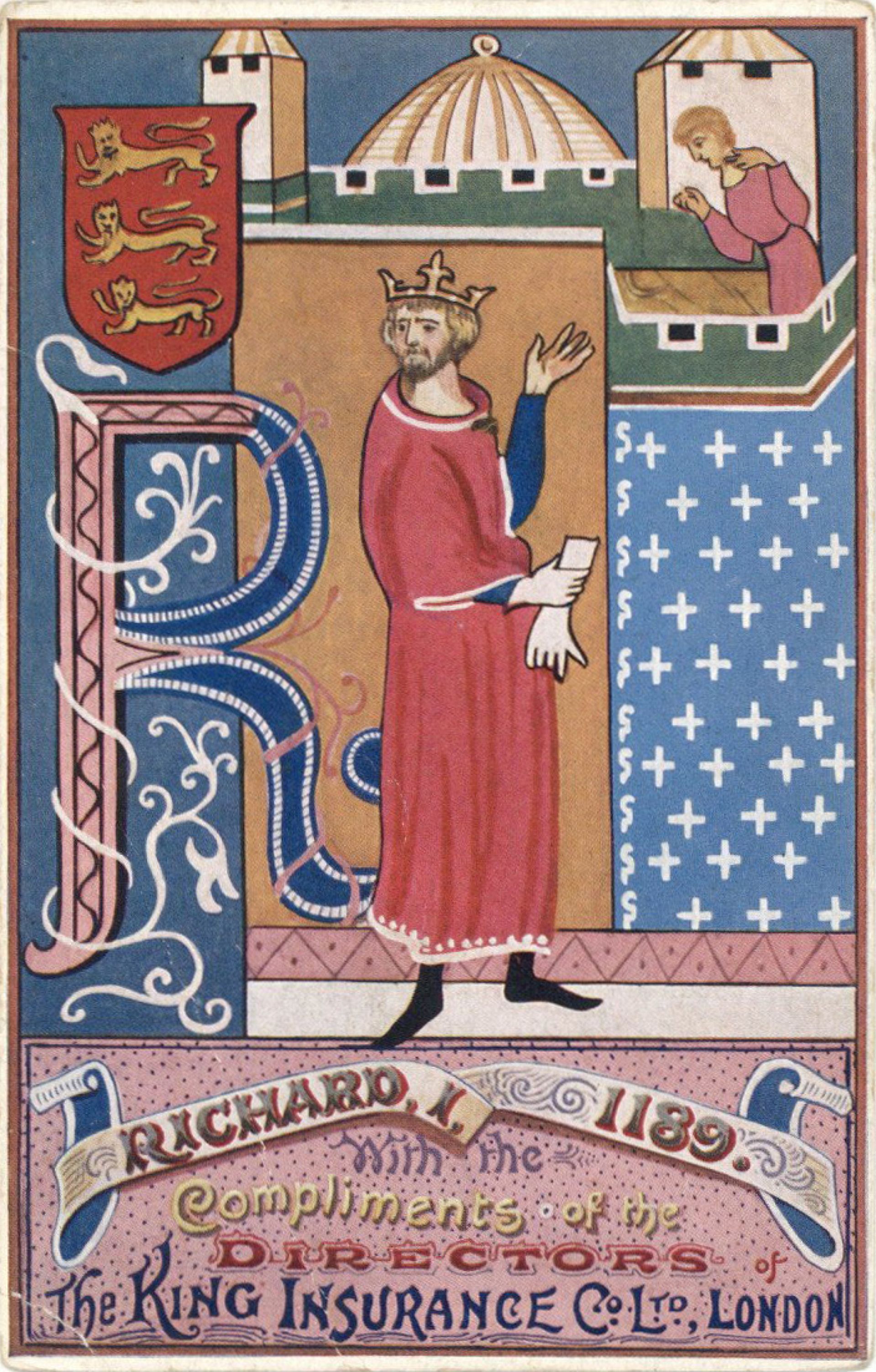 Post Card advertisement for the King Insurance Co. Ltd. of London, England. Featuring Richard I. Measures approximately 3 1/2" x 5 1/2". The backside of card is blank.