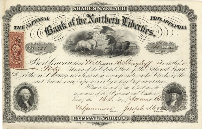 National Bank of the Northern Liberties - 1865 dated Banking Stock Certificate