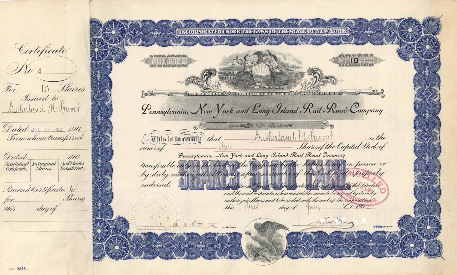 Pennsylvania, New York and Long Island Rail Road Co. - 1902 dated Stock Certificate