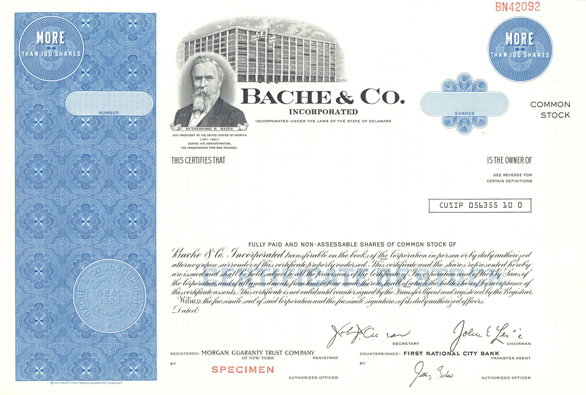 Bache and Co. Inc. - Specimen Stock Certificate - Only Blue or Green Available - Depicts Rutherford B. Hayes in this Bache Vignette - Very Rare