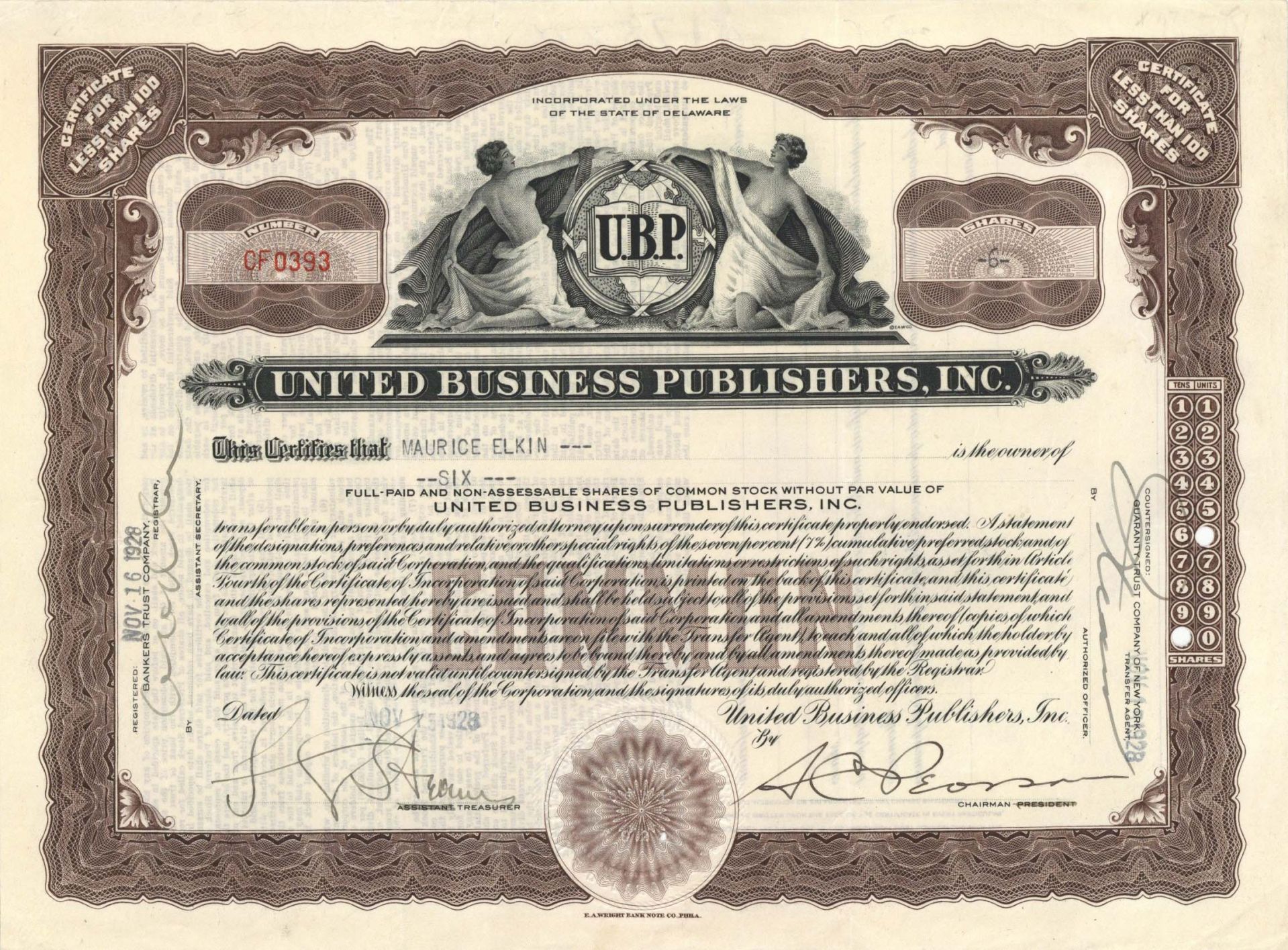 United Business Publishers, Inc. - 1928 dated Stock Certificate