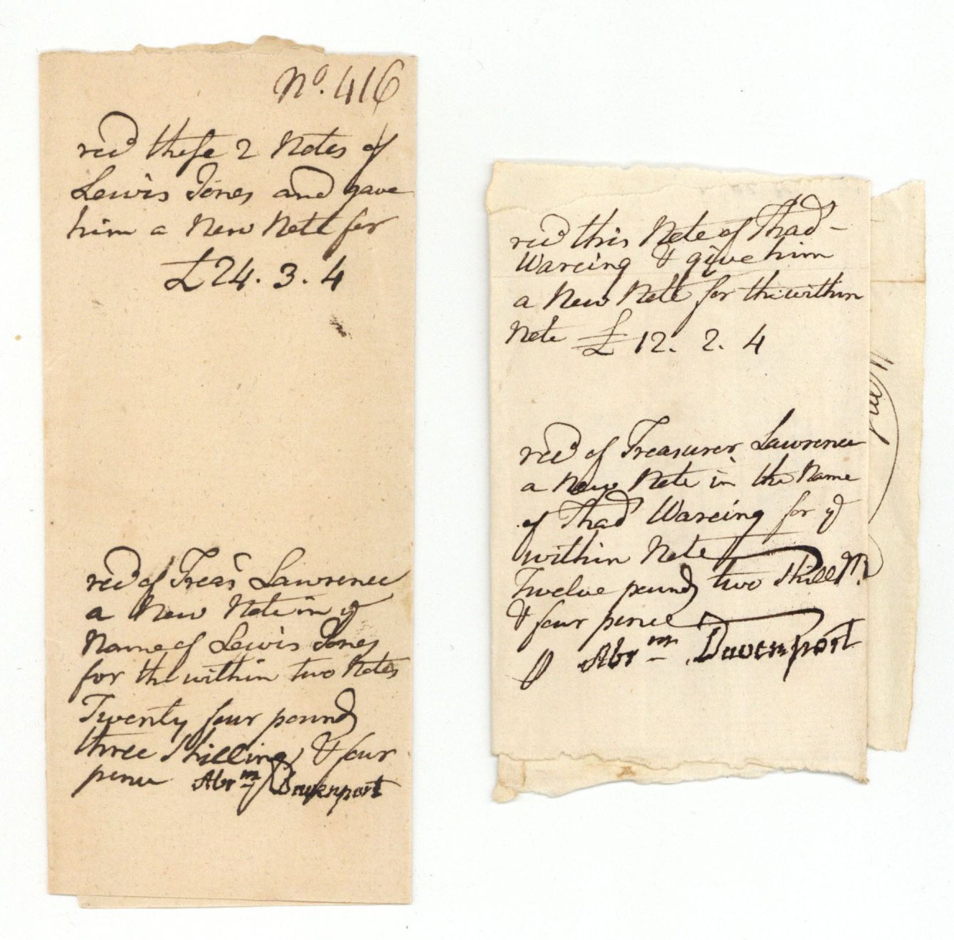 Pair of documents dated in the 1770's regarding the theft of 2 notes. Mentions treasurer Lawrence.