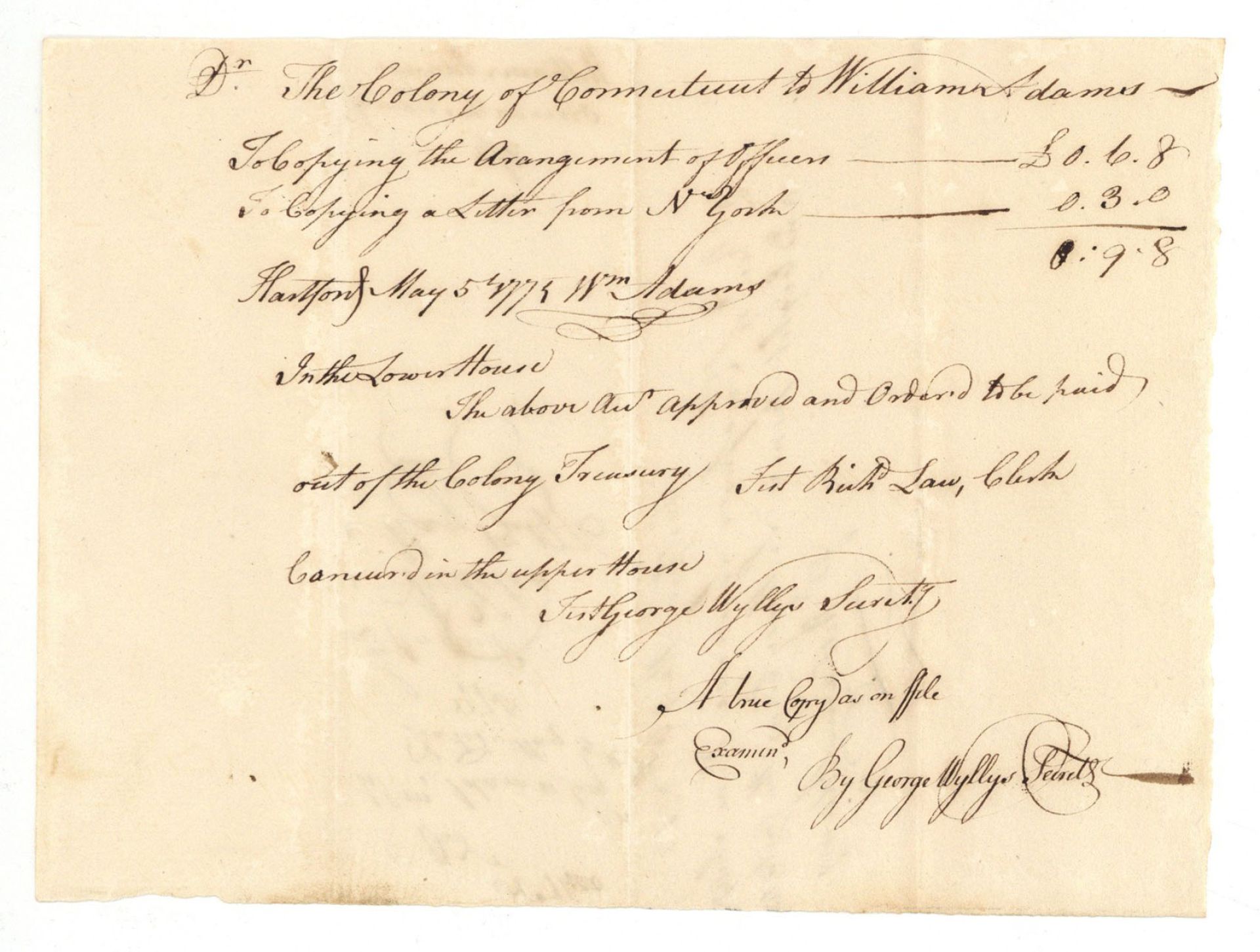 Pay Order to William Adams to be paid out of the Colony Treasury.