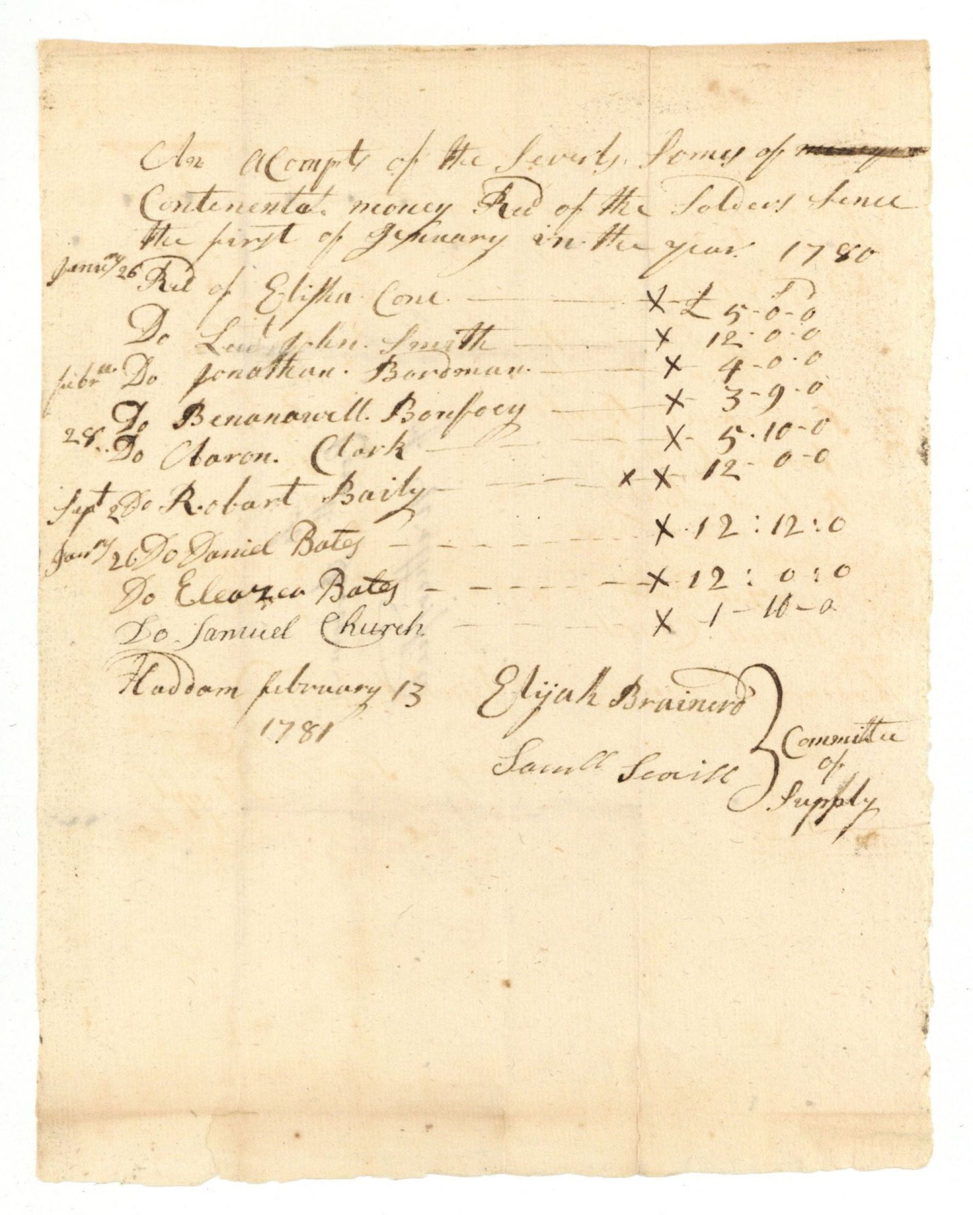 Handwritten account of money received by the Town of Haddam from Continental soldiers.
