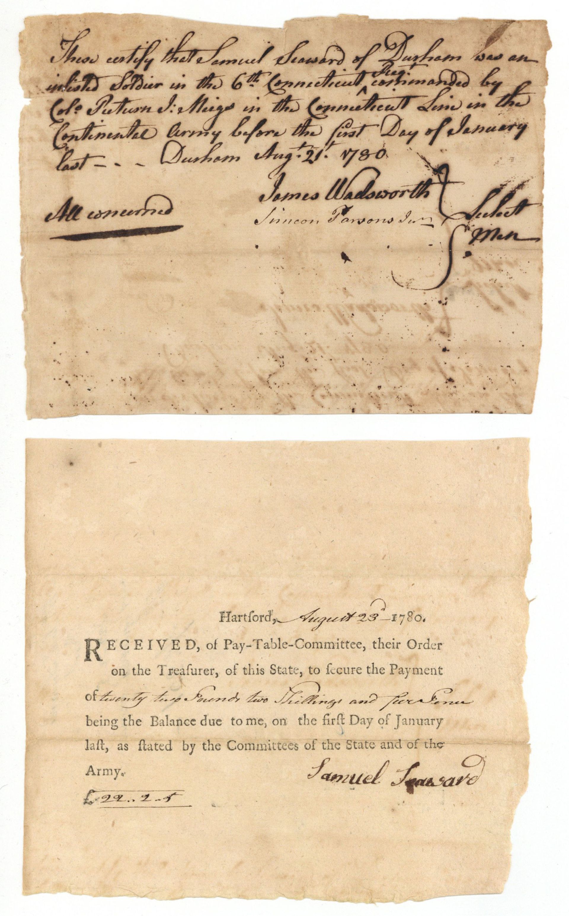 Pair of documents. Receipt of Pay Table Committee and handwritten note certifying that Samuel Seward of Durham was an enlisted Soldier.
