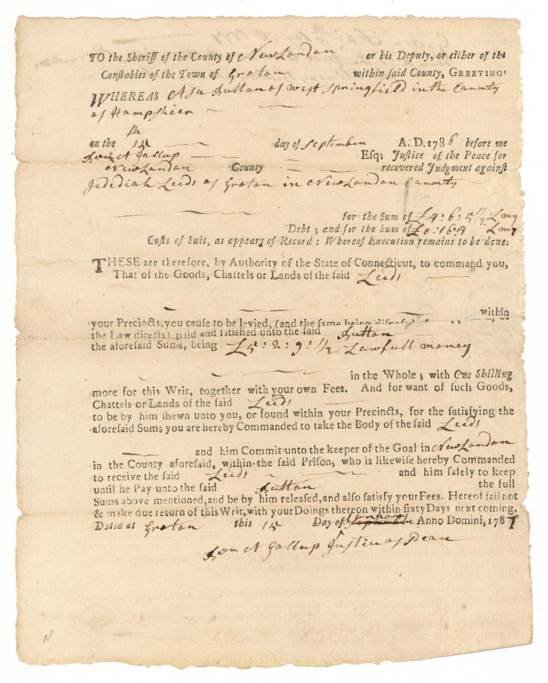 Court document related to payment of debt. Measures 7" x 8 3/4".