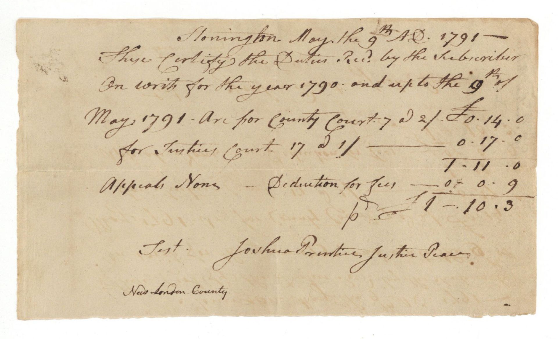 Document for duties on writs of 1790 and 1791. New London County, Stonington, Connecticut.