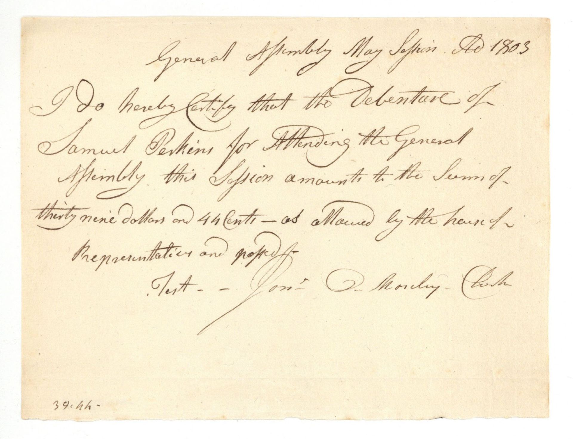 Handwritten Pay Order for Samuel Perkins for attending the General Assembly.