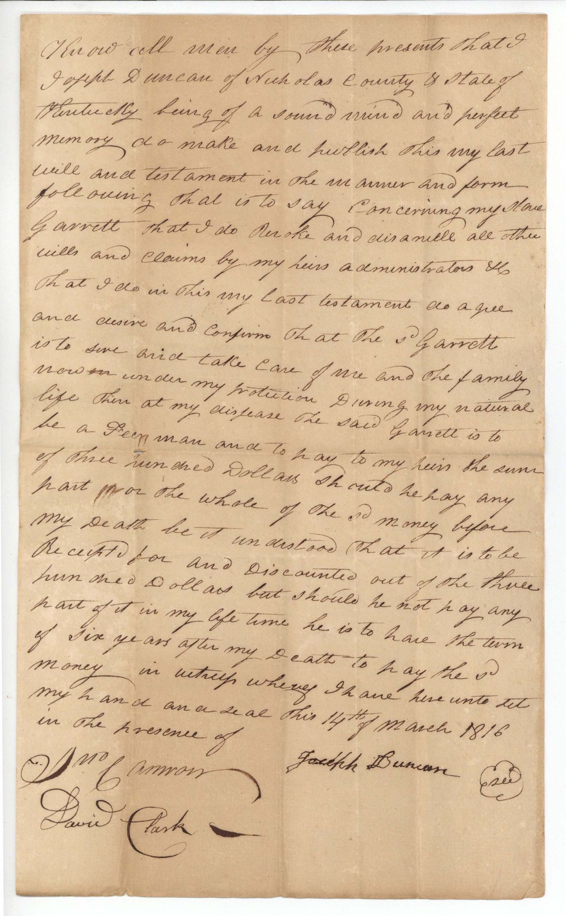 Inv# AM2491Last Will and Testament of Joseph Duncan freeing slave named Garrett.