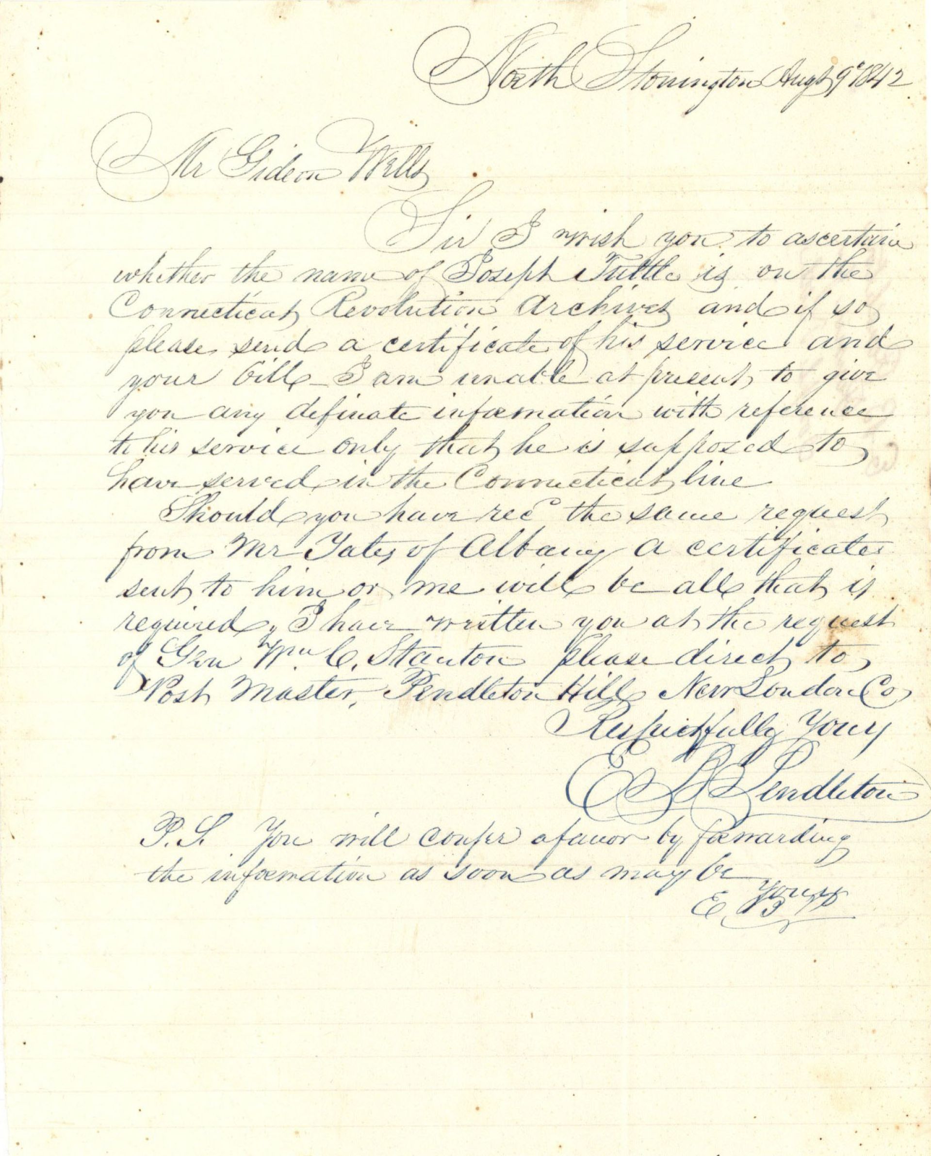 Handwritten letter verifying the service of Joseph Tuttle in the Connecticut Revolution. Requested by Gen'l Wm. C. Stanton. Stonington, Connecticut.