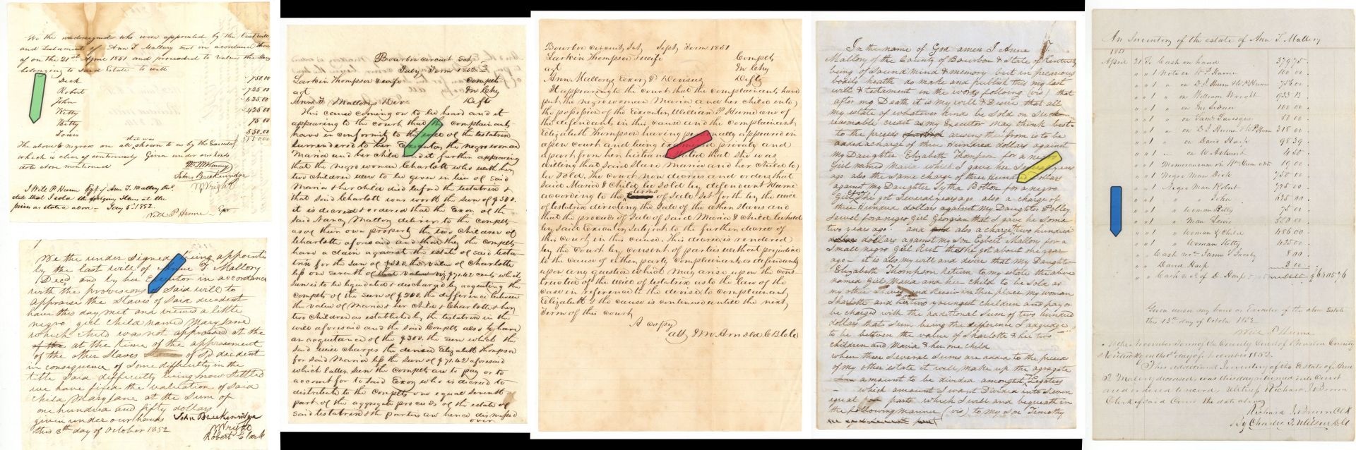 Six handwritten documents related to Will of Anne Mallory which mentions slaves. Some staining.