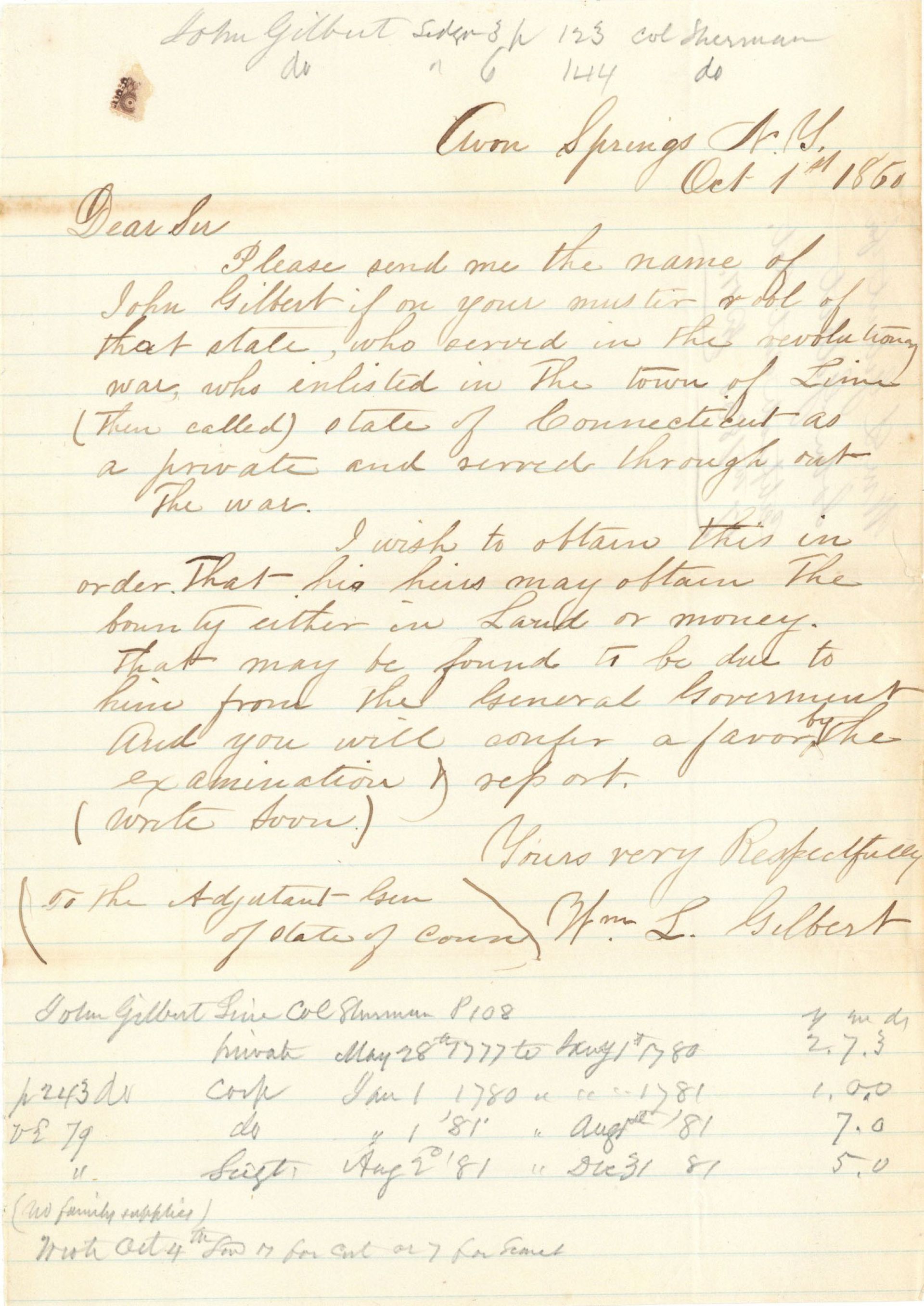 Handwritten request to verify service in Revolution in order to "obtain the bounty either in Land or money". "town of Lime (then called) State of Connecticut.