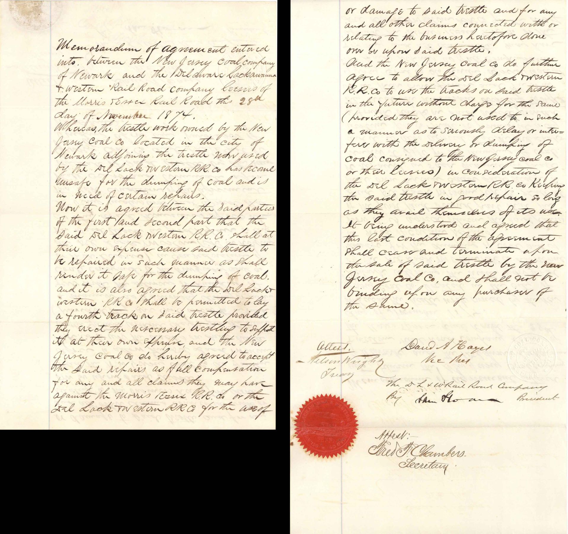 2 page Agreement between the Delaware, Lackawanna & Western Railroad Company and the New Jersey Coal Company signed by Sam Sloan.