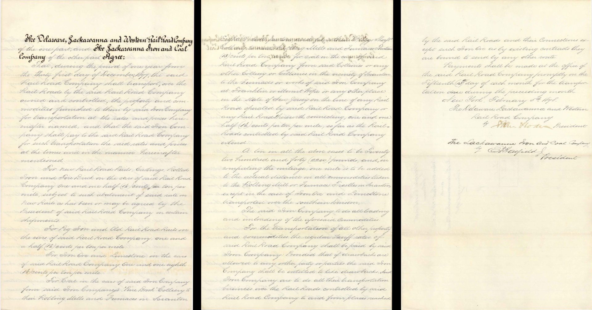 3 page Agreement between the Delaware, Lackawanna and Western Rail Road Company and the Lackawanna Iron and Coal Company signed by Sam Sloan as president. Signature faded.