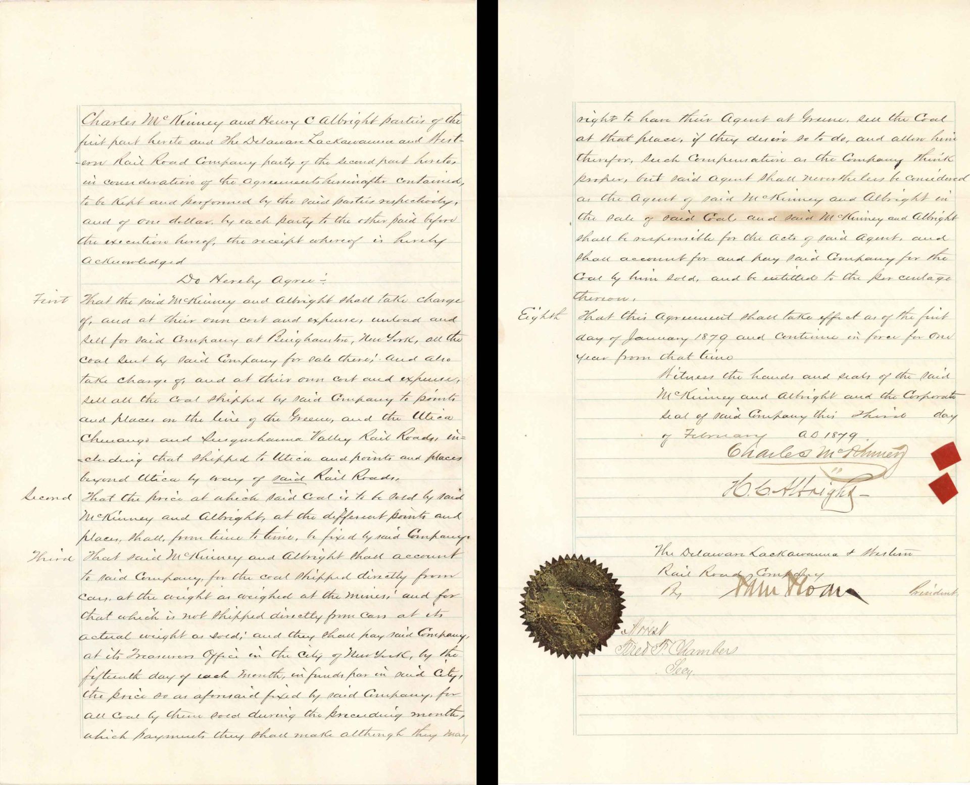 4 page agreement between the Delaware, Lackawanna and Western Rail Road Company and Charles McKinney and Henry C. Albright signed by Sam Sloan as president. 1st and signature pages shown.