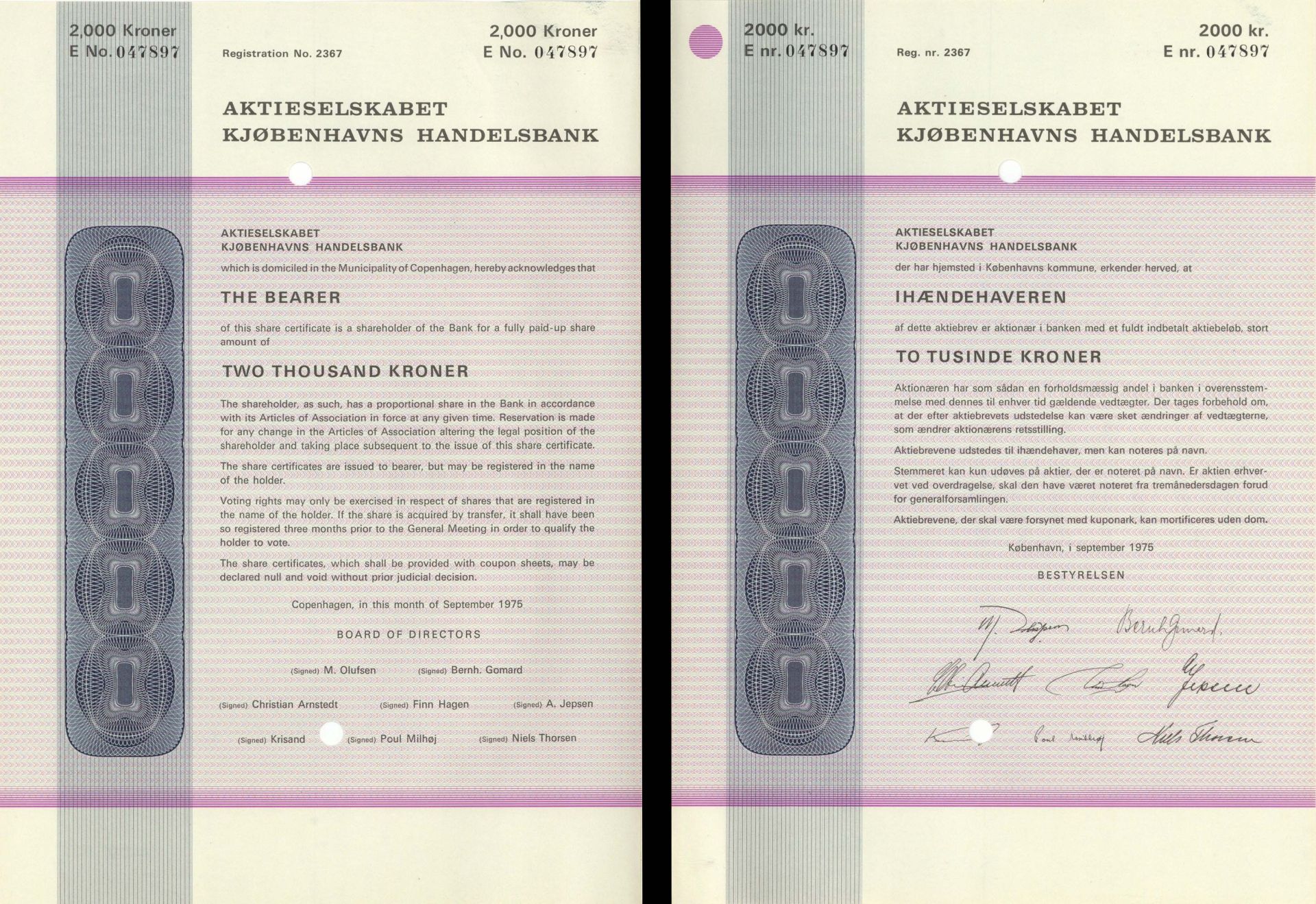 Aktieselskabet Kjobenhavns Handelsbank - 1975 dated Stock Certificate