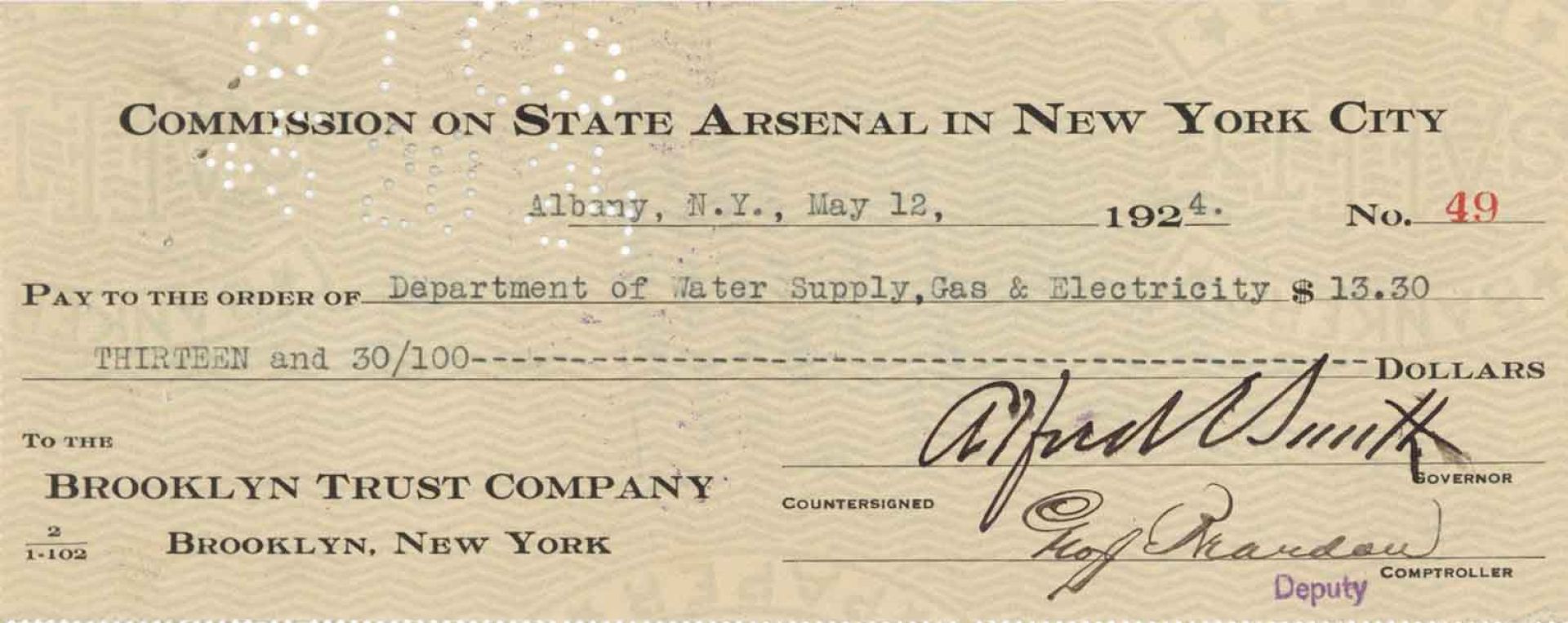 Brooklyn Trust Company check for the Commission on State Arsenal in New York City signed at front by Alfred (Al) Smith as Governor. Nice!