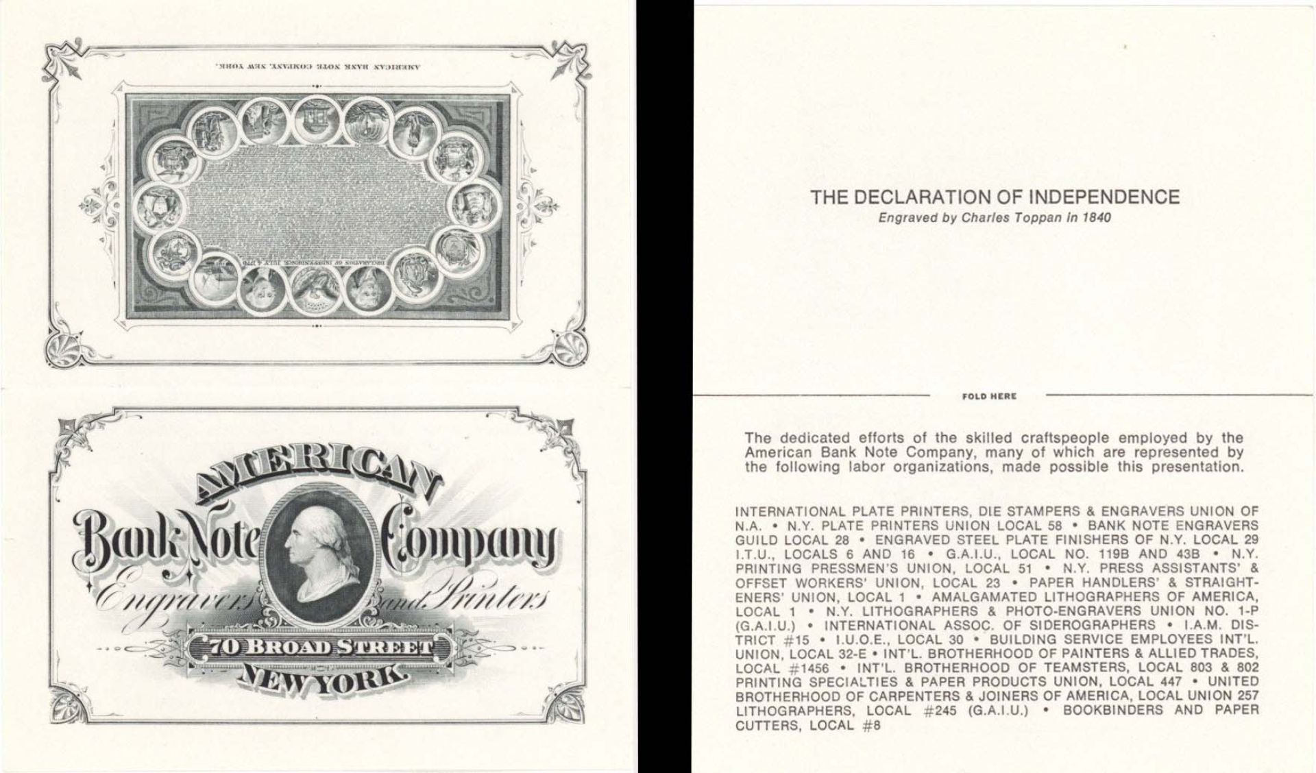 Ad Card for American Bank Note Company Engravers and Printers. "The Declaration of Independence" engraved by Charles Toppan in 1840. The card states: "The dedicated efforts of the skilled craftspeople employed by the American Bank Note Company, many of which are represented by the following labor organizations, made possible this presentation." Business card size of 4 1/4" x 2 1/2" when folded. Both sides shown.